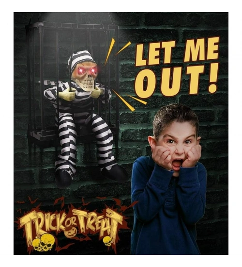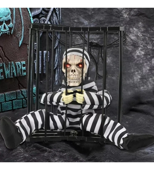 Hareketli Sesli Sensörlü Mahkum Görünümlü Kuru Kafa İskelet Dekorasyon 22x27 cm