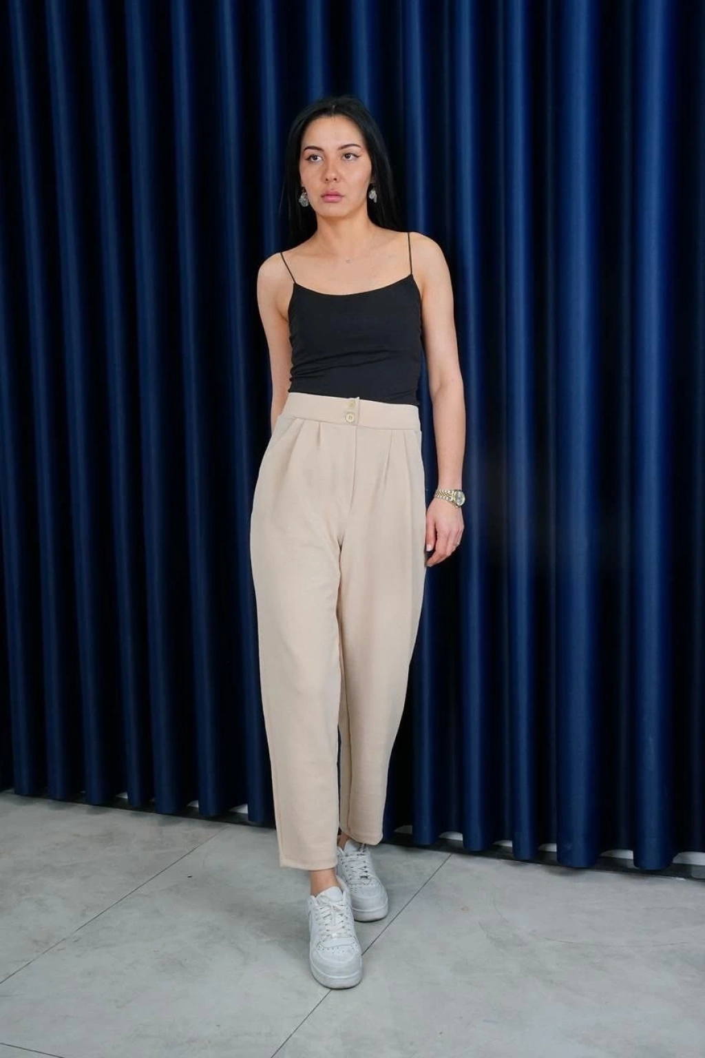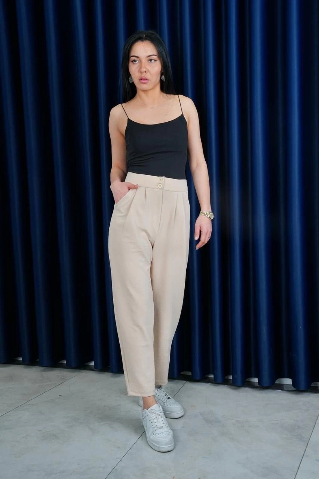 İspanyol yırtmaçlı paça deri pantolon bej hn