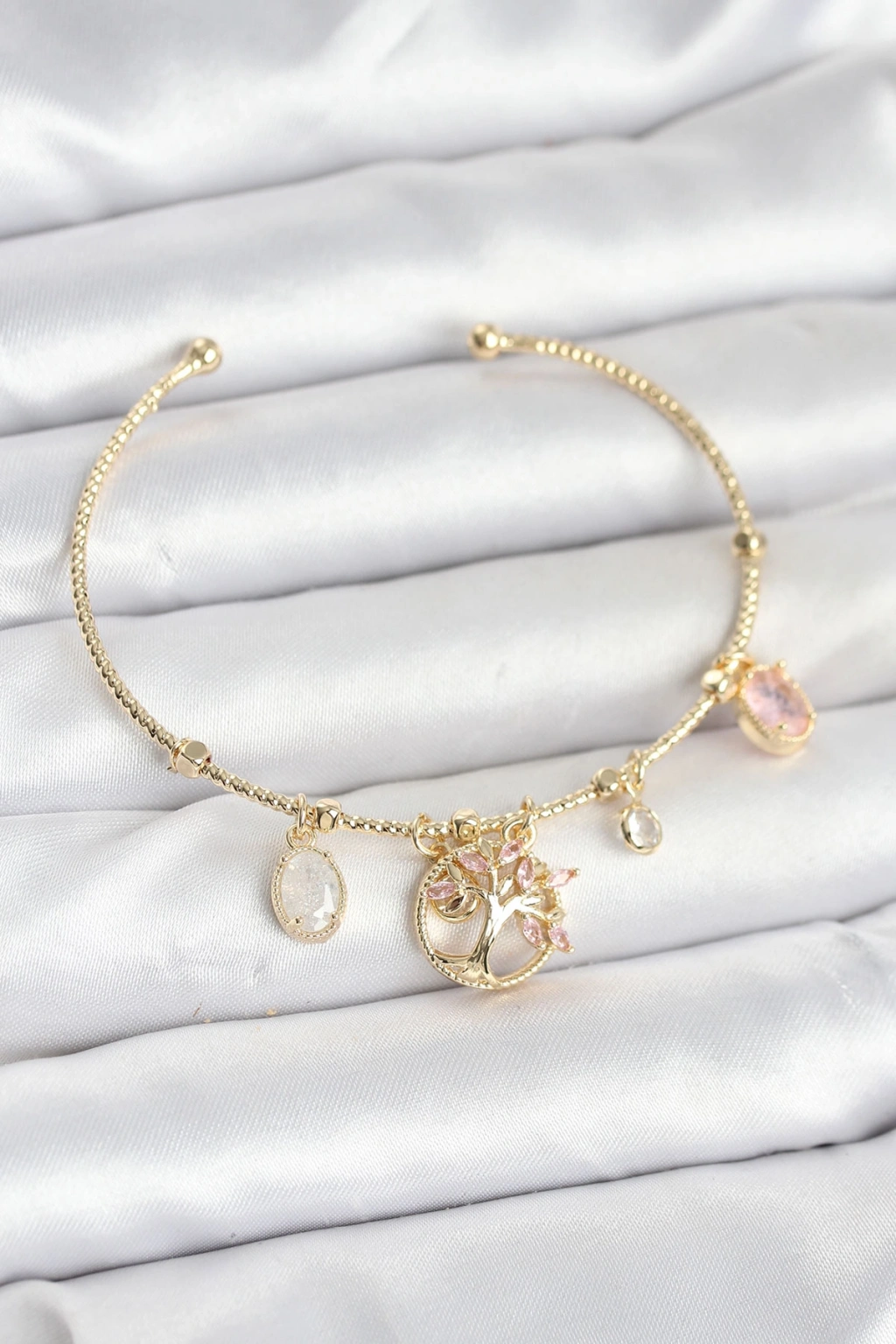 Hayat Ağacı Charmlı Gold Renk Pirinç Kadın Bileklik