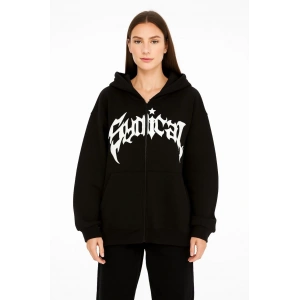 KADIN KAPÜŞONLU 3 İPLİK ŞARDONLU ÖNÜ BASKILI FERMUARLI OVERSİZE SWEATSHİRT - SİYAH