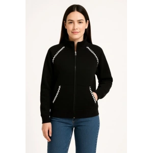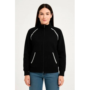 KADIN OVERSİZE DİK YAKA FERMUARLI SWEATSHİRT - ZİNCİR NAKIŞLİ KANGURU CEPLİ, - SİYAH