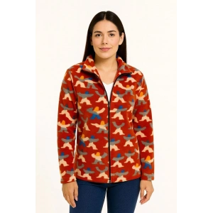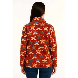 KADIN TAM FERMUARLI DESENLİ POLAR SWEAT – SİYAH MULTİCOLOR FİGÜR DESEN YAKALI, UZUN KOLLU, OVERSİZE RAHAT KALIP - KİREMİT