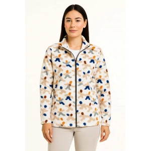 KADIN TAM FERMUARLI DESENLİ POLAR SWEAT – SİYAH MULTİCOLOR FİGÜR DESEN YAKALI, UZUN KOLLU, OVERSİZE RAHAT KALIP - BEYAZ