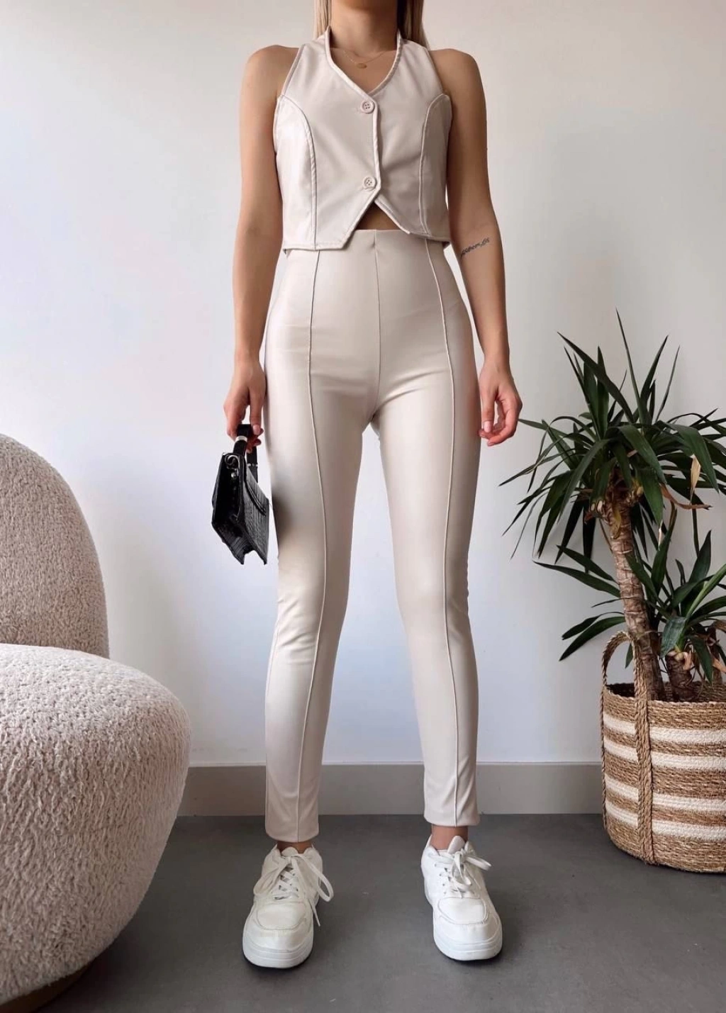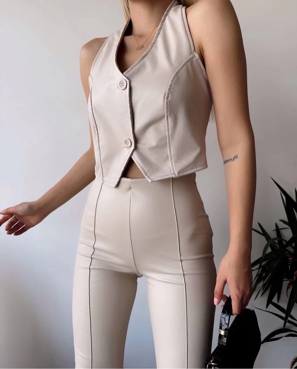 İki düğmeli deri yelek krem s243001