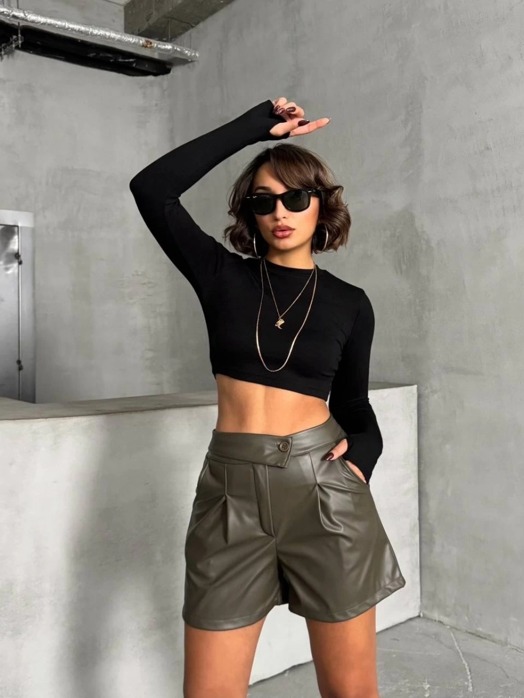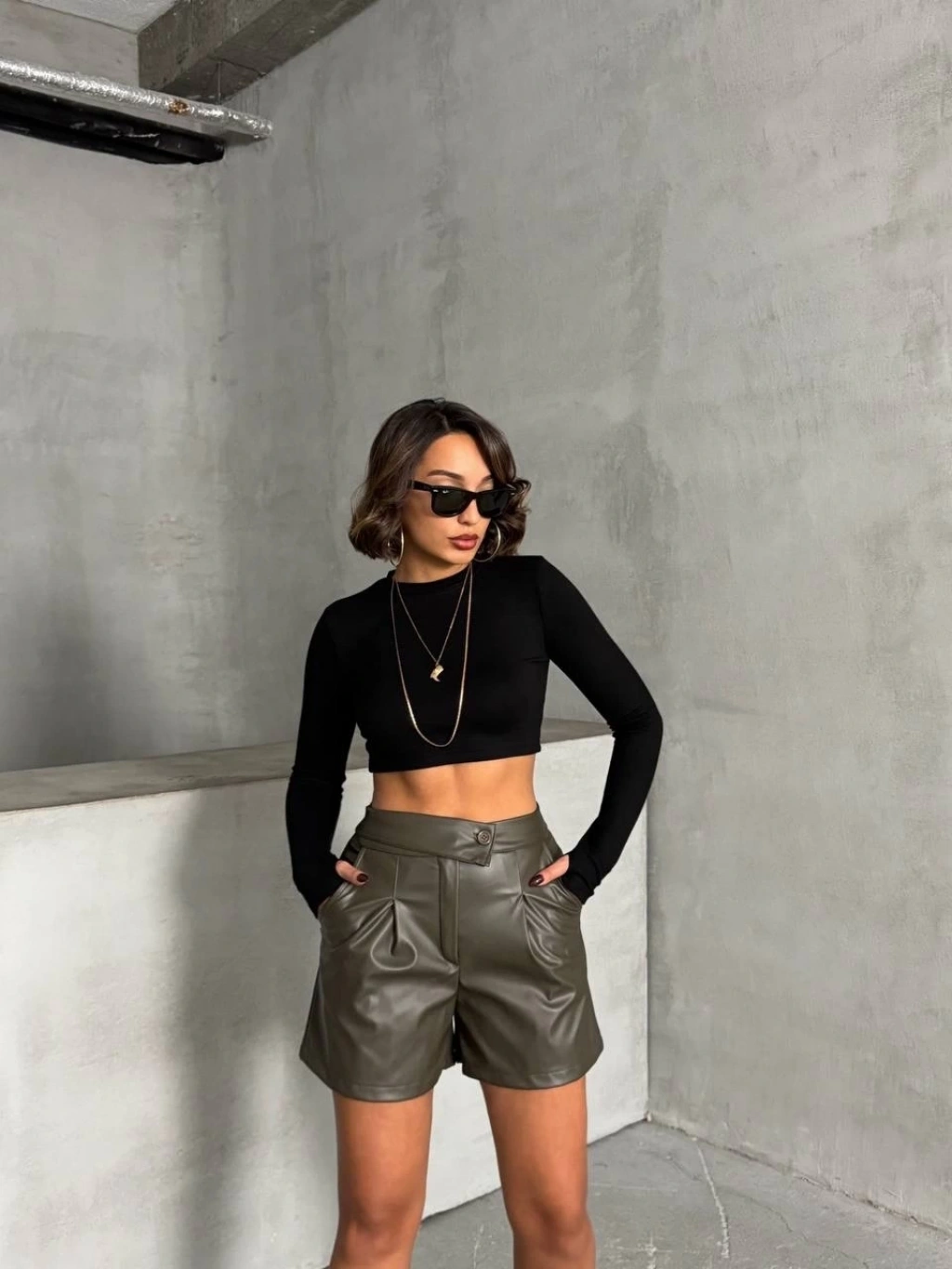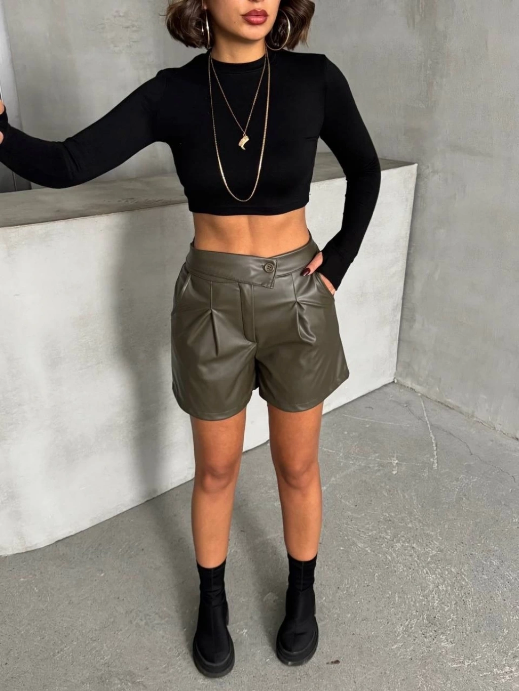 Pileli deri şort siyah h240053