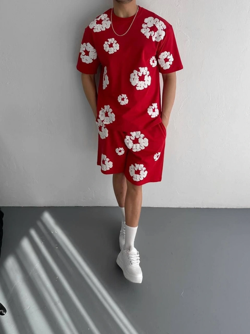 Erkek Nakış İşlemeli Şortlu Takım - Beyaz