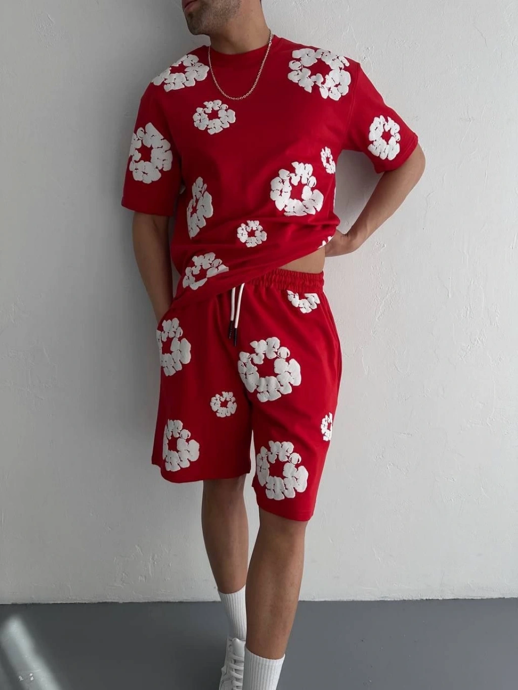İki İplik Kumaş Baskılı T-shirt Şortlu Takım- Kırmızı