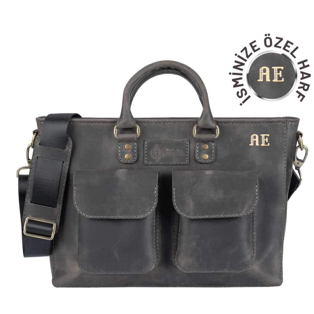 İsme Özel Askılı Cepli Evrak - Laptop Çantası - %100 Crazy Deri - AC09003 - Antrasit