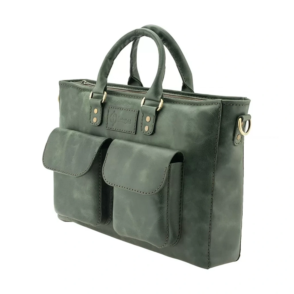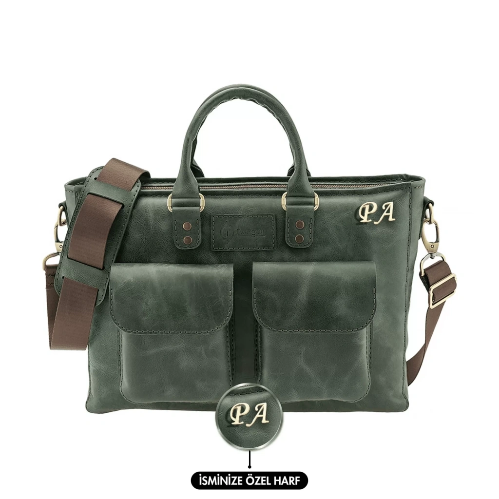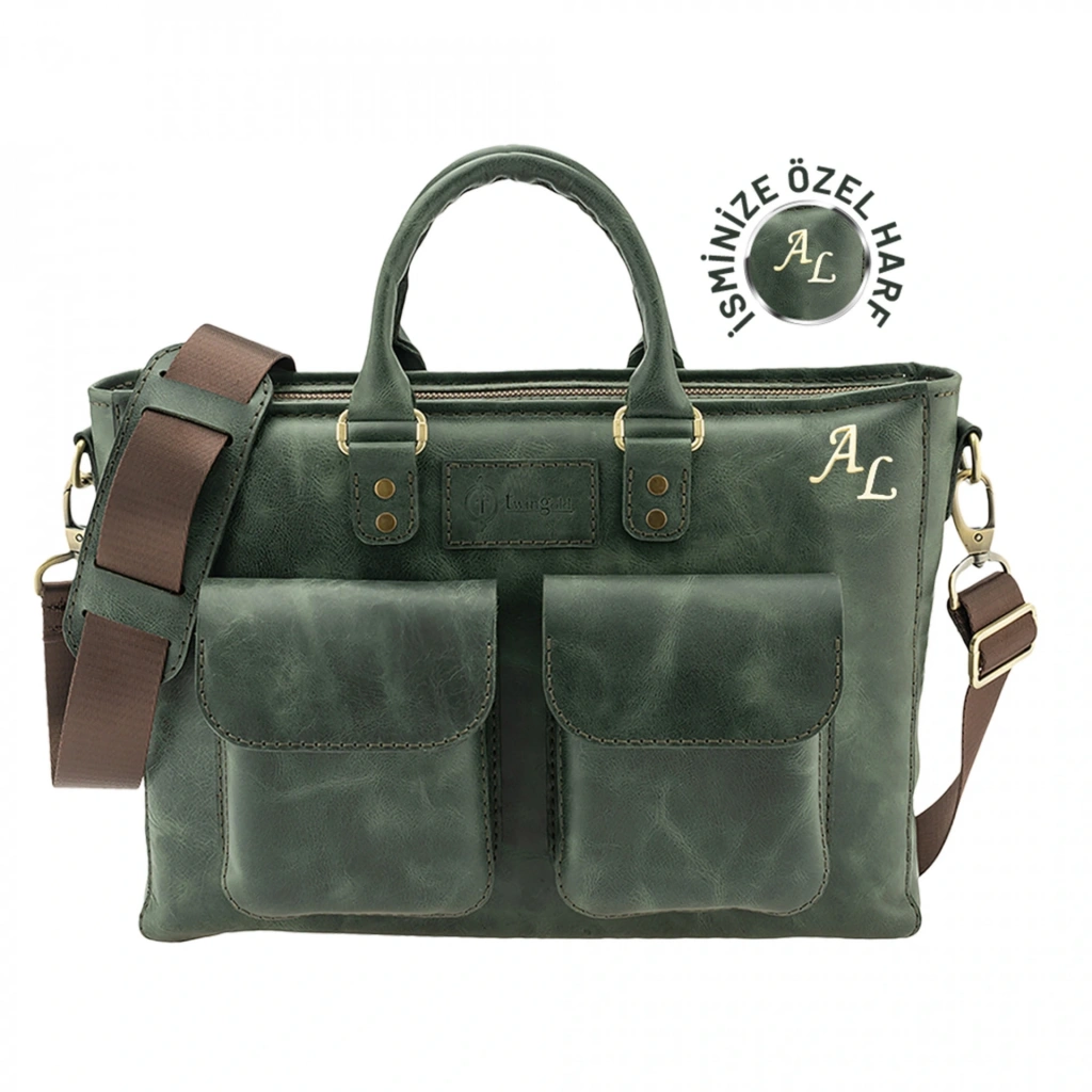 İsme Özel Askılı Cepli Evrak - Laptop Çantası - %100 Rainbow Deri - AC09002 - Haki