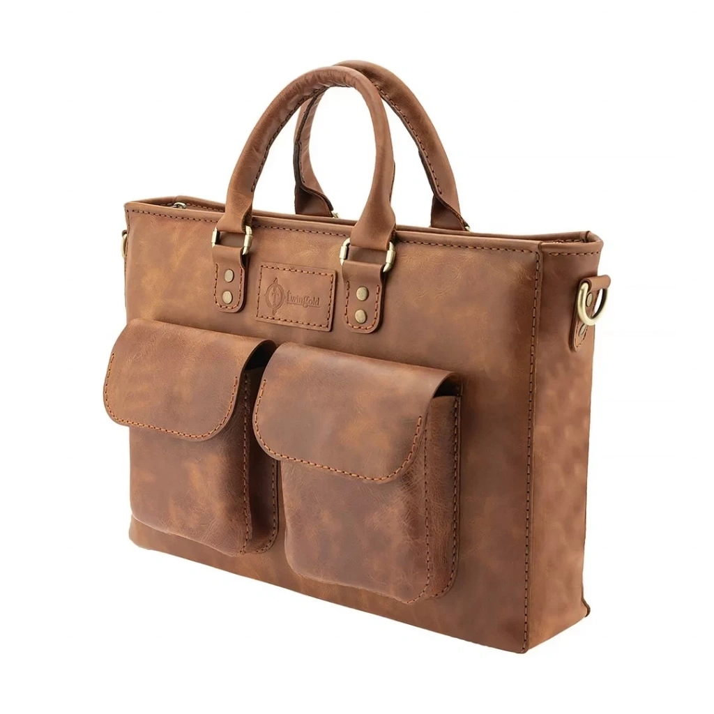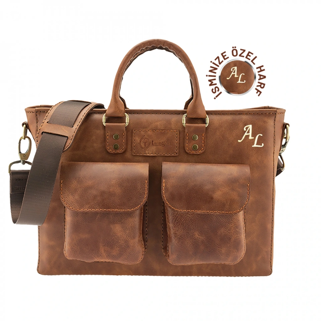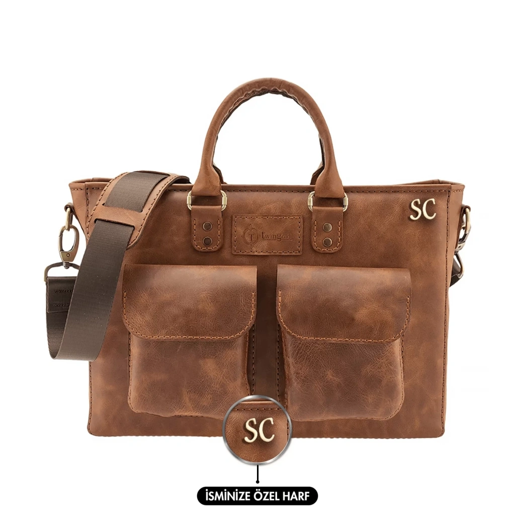İsme Özel Askılı Cepli Evrak - Laptop Çantası - %100 Rainbow Deri - AC09002 - Kahverengi