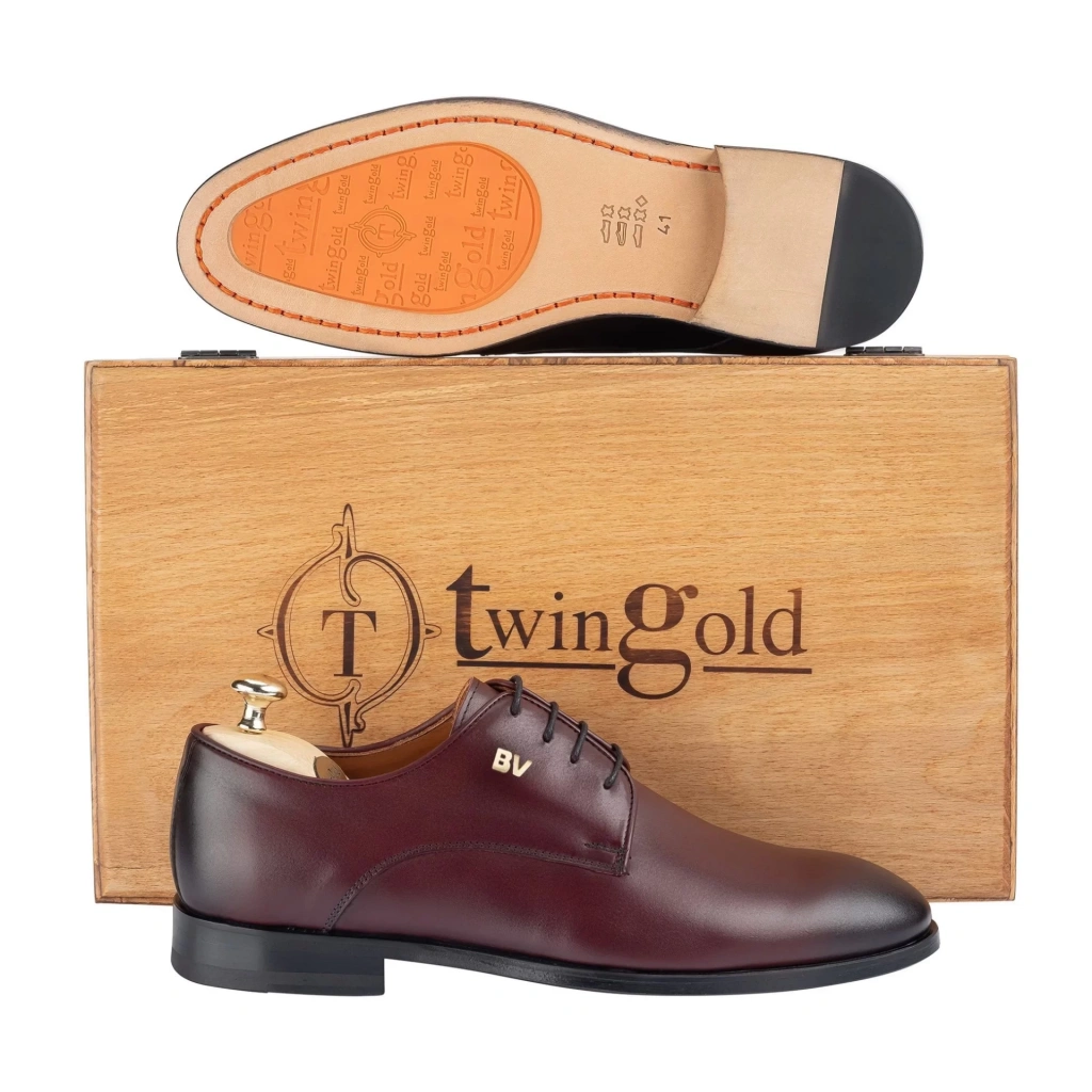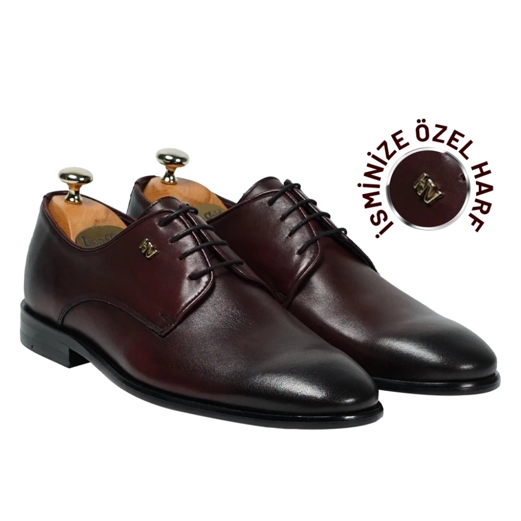 İsme Özel Bağcıklı Kösele Erkek Ayakkabı - %100 Hakiki Antik Deri - Altın Harf - AA01001 - Bordo
