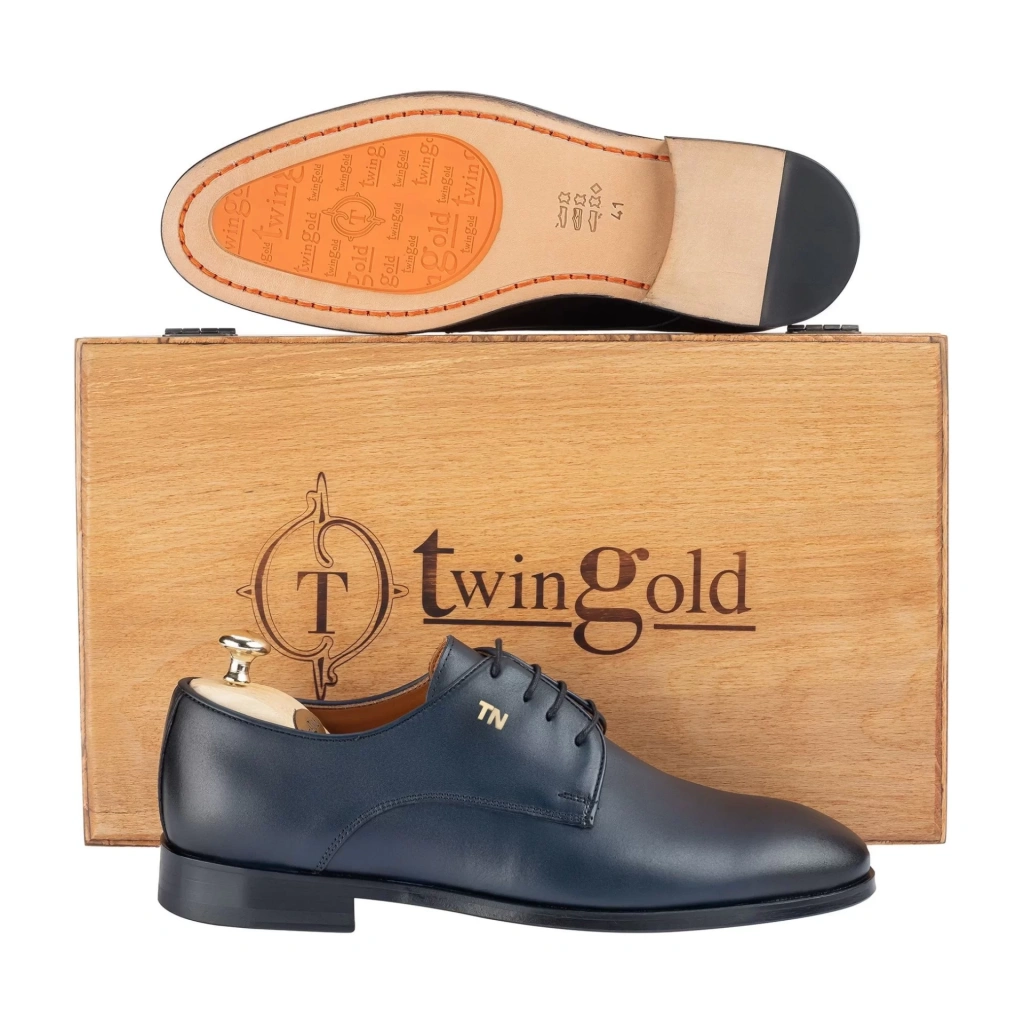 İsme Özel Bağcıklı Kösele Erkek Ayakkabı - %100 Hakiki Antik Deri - Altın Harf - AA01001 - Lacivert