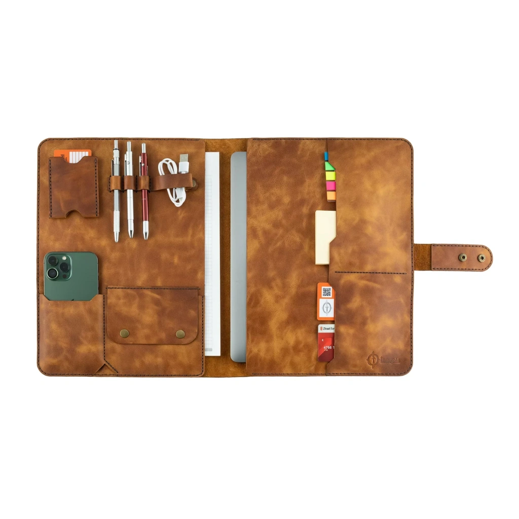 İsme Özel Çıtçıtlı Fonksiyonlu Macbook Organizer - %100 Rainbow Deri - ET02001 - Camel