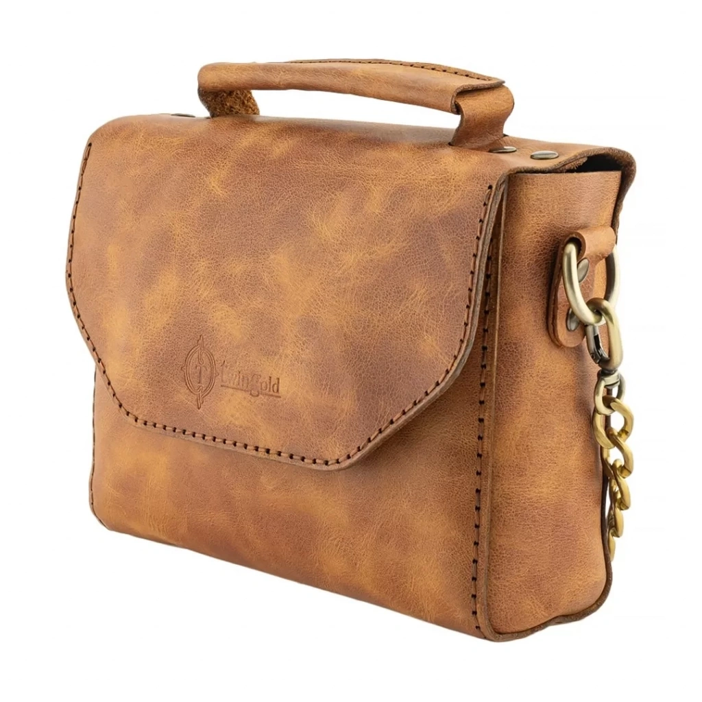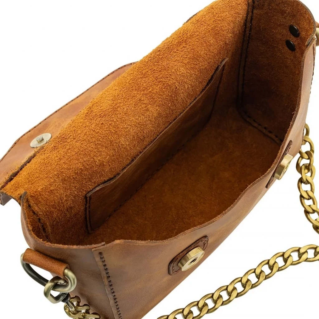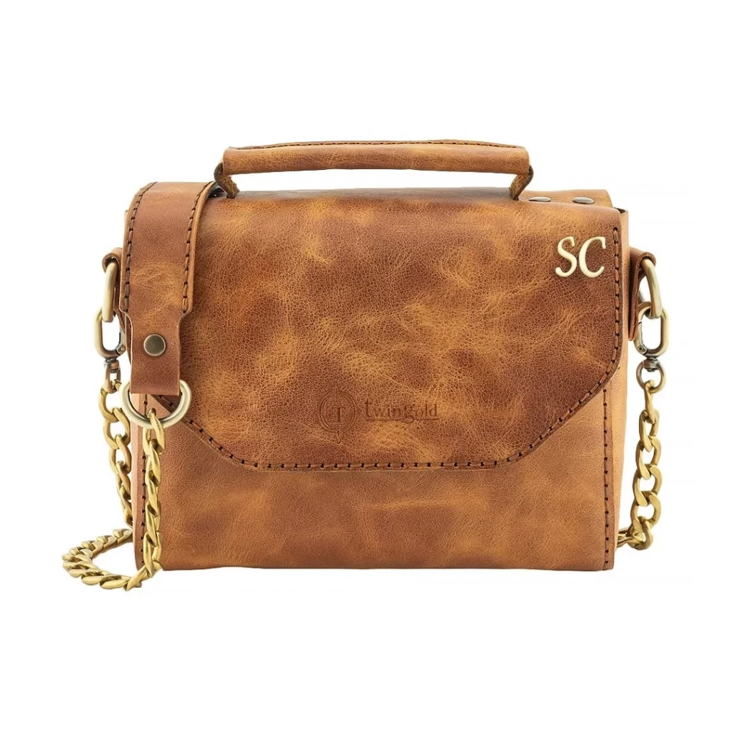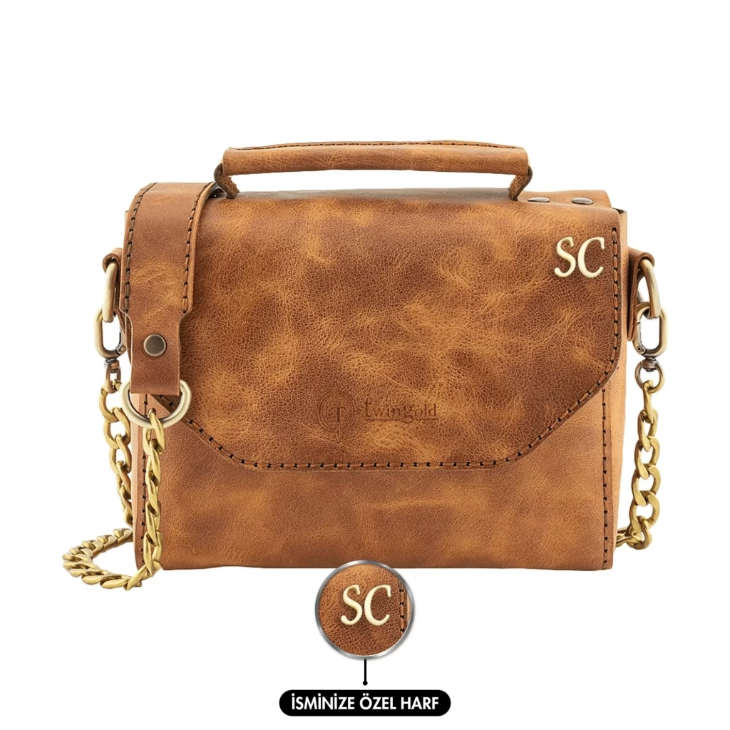 İsme Özel Çıtçıtlı Zincirli Küçük Boy El Omuz Çantası - %100 Deri - AC03001 - Camel