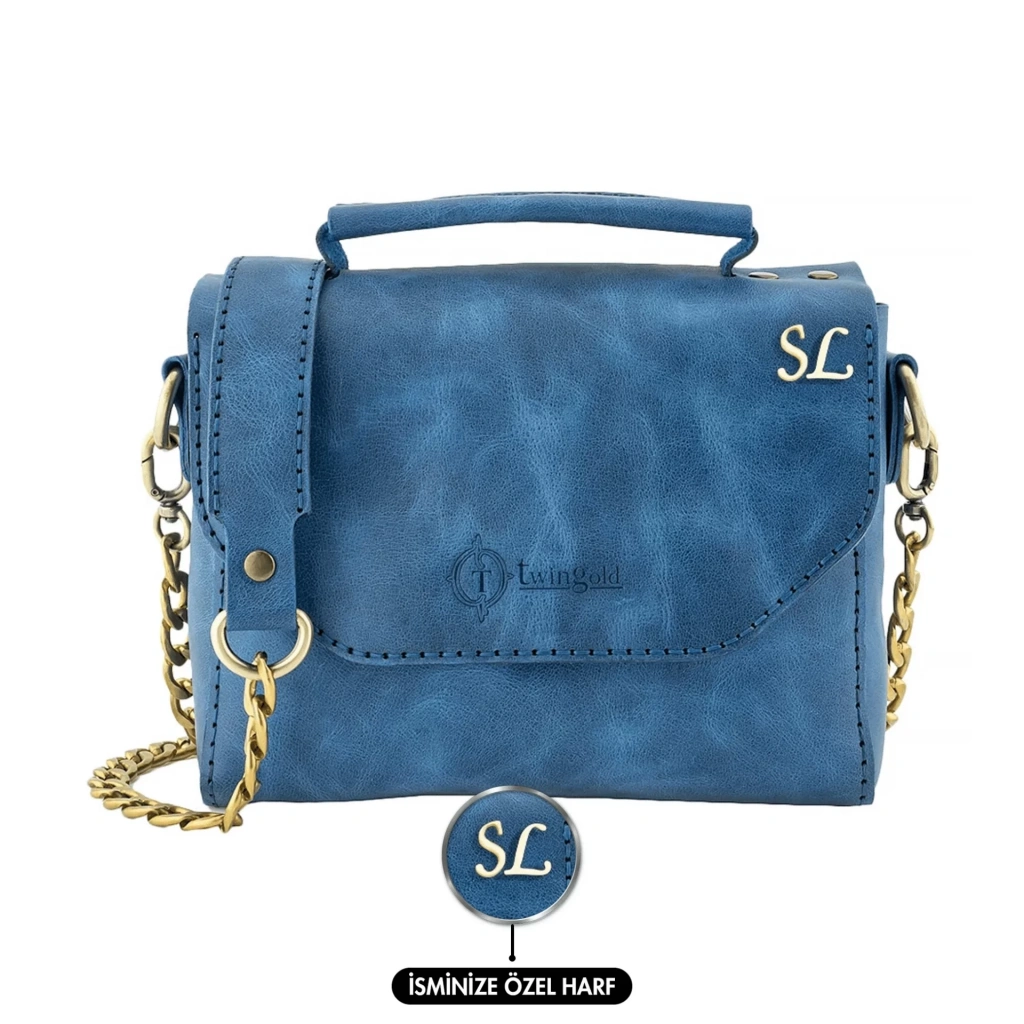 İsme Özel Çıtçıtlı Zincirli Küçük Boy El Omuz Çantası - %100 Deri - AC03001 - Saks Mavisi