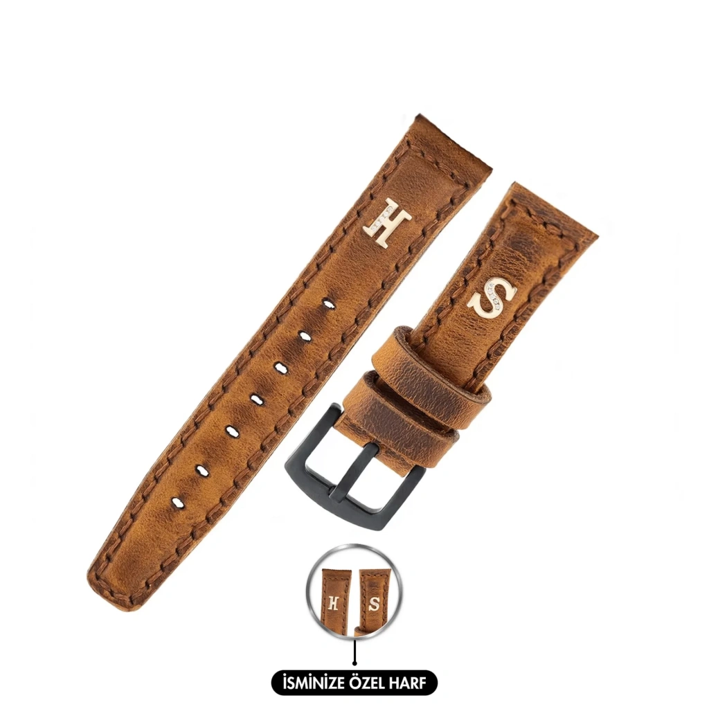 İsme Özel El Dikişli Saat Kordonu - %100 Crazy Deri - AG03002 - Taba