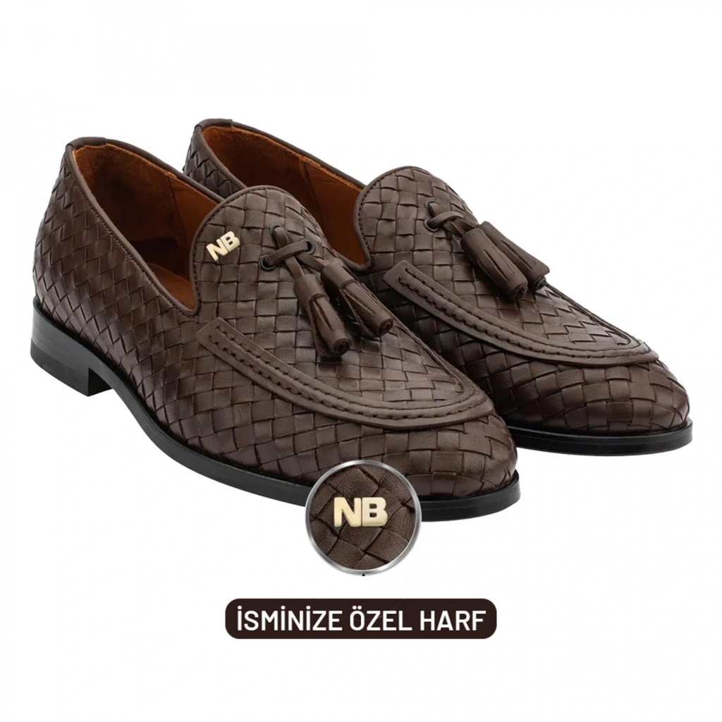 İsme Özel El Örgüsü Kösele Erkek Ayakkabı - %100 Hakiki Deri - Altın Harf - AA01002 - Kahverengi