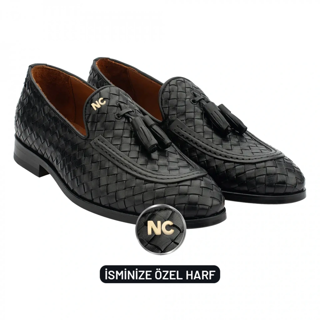 İsme Özel El Örgüsü Kösele Erkek Ayakkabı - %100 Hakiki Deri - Altın Harf - AA01002 - Siyah