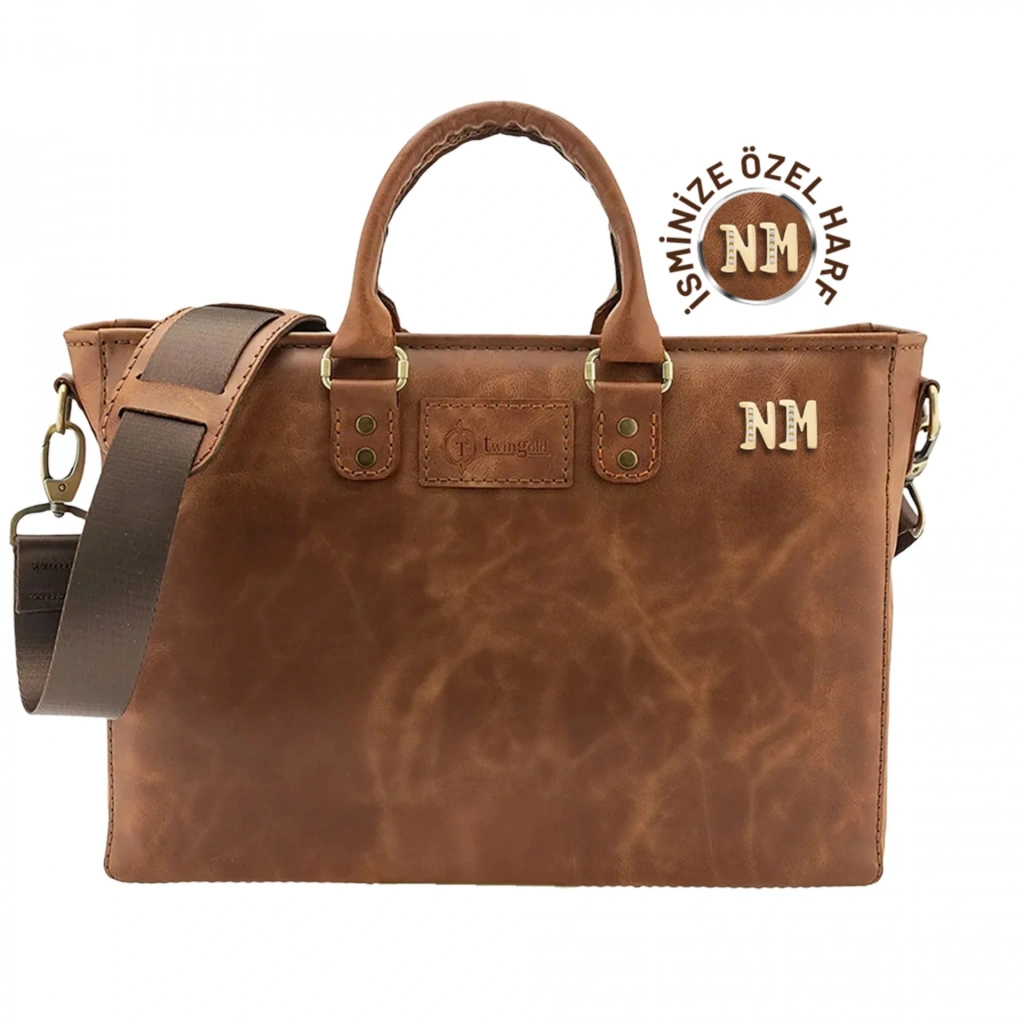 İsme Özel Günlük Kullanım El Omuz Evrak Laptop Çantası - %100 Deri - AC09004 - Kahverengi
