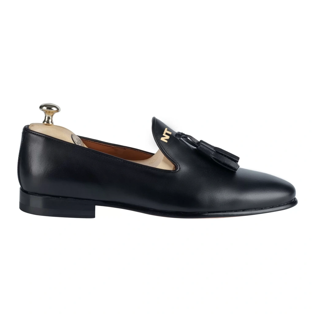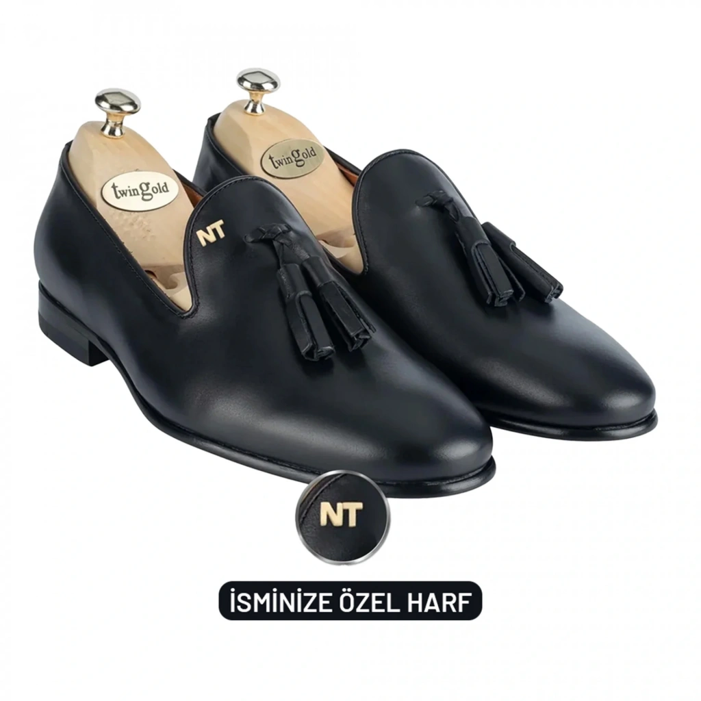 İsme Özel Püsküllü Kösele Erkek Ayakkabı - %100 Hakiki Antik Deri - Altın Harf - AA01008 - Siyah