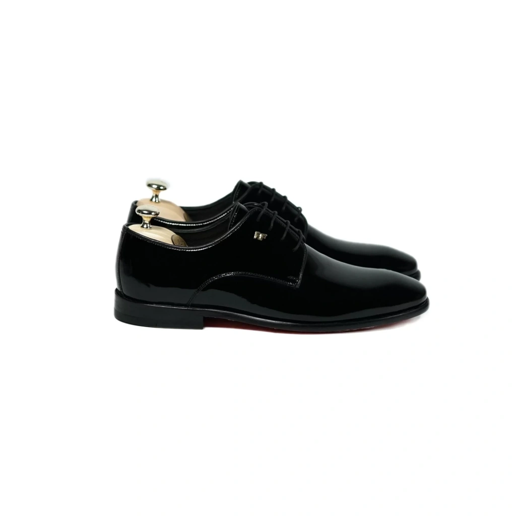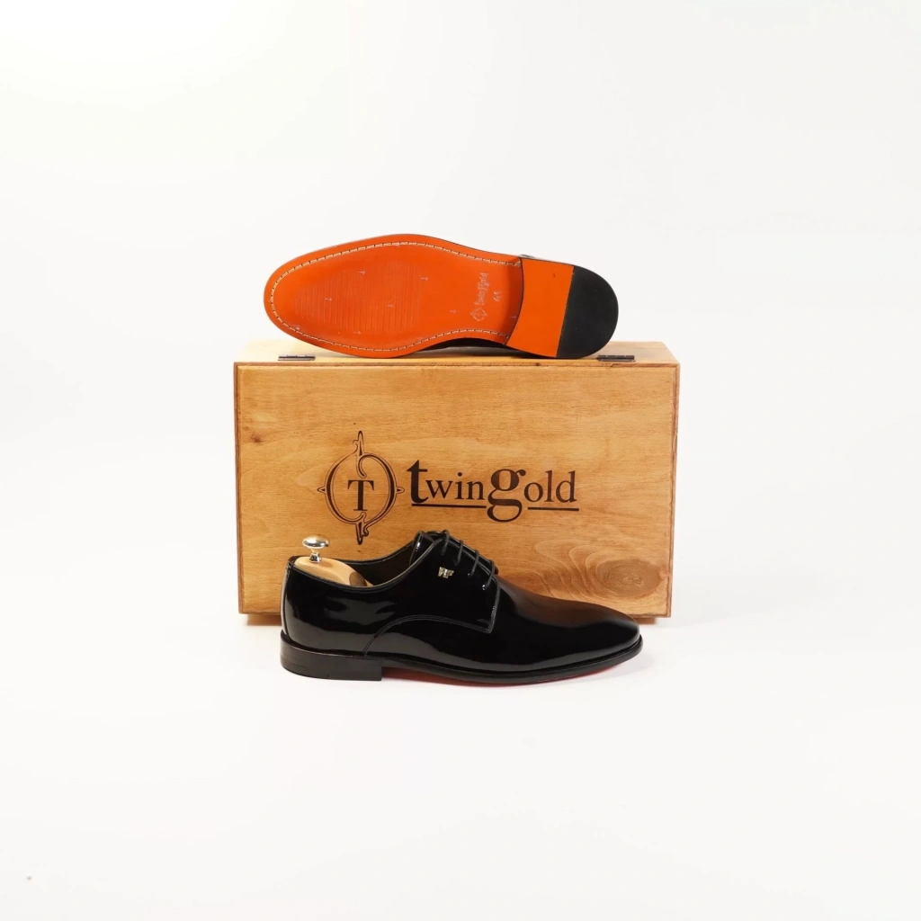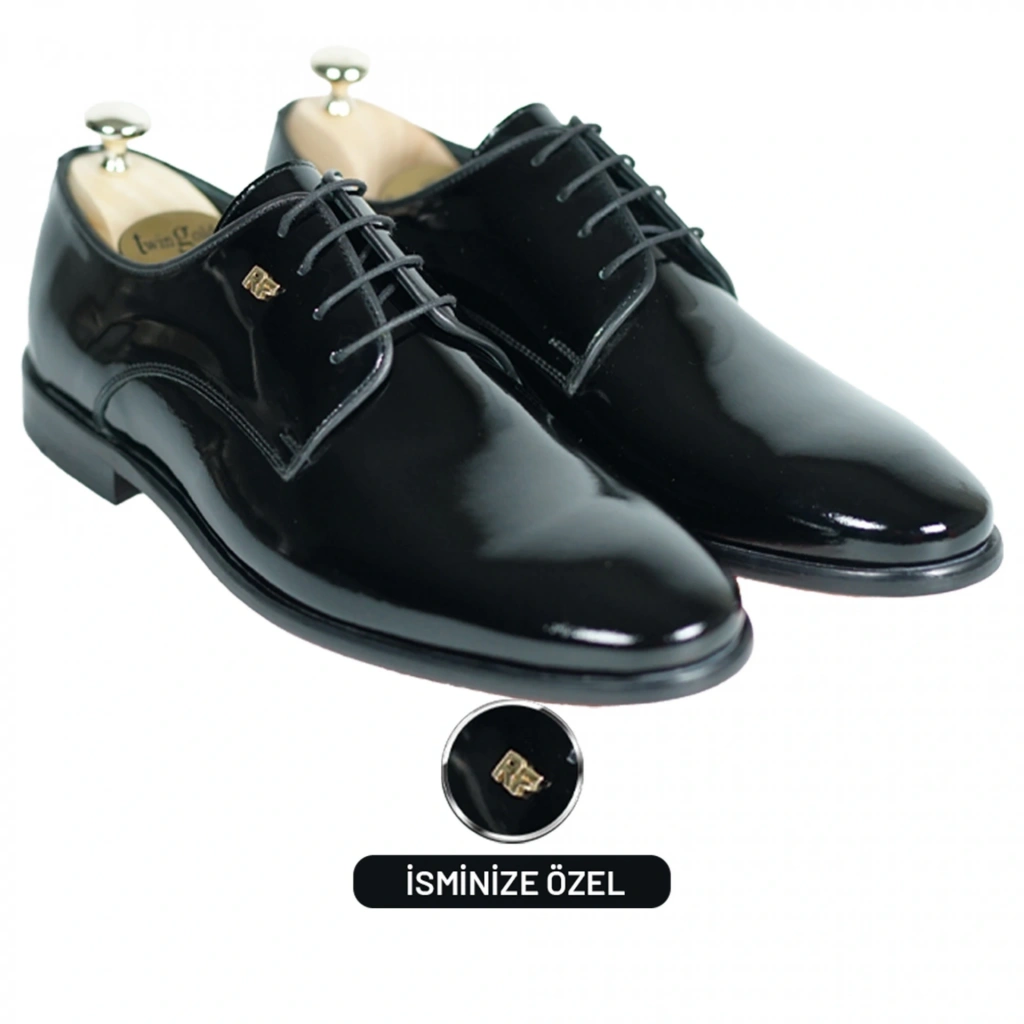 İsme Özel Rugan Bağcıklı Kösele Erkek Ayakkabı - %100 Hakiki Deri - Altın Harf - AA01006 - Siyah