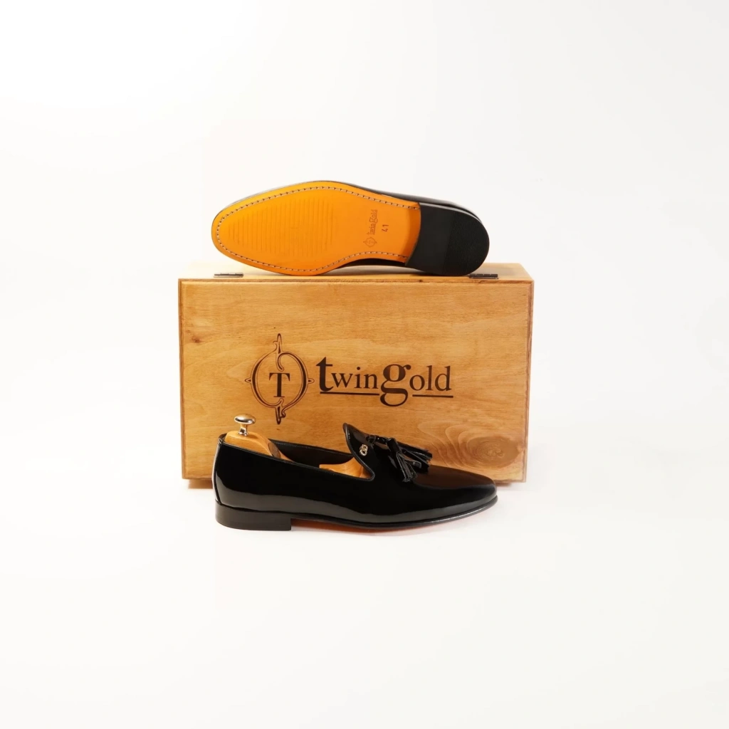 İsme Özel Rugan Püsküllü Kösele Erkek Ayakkabı - %100 Hakiki Deri - Altın Harf - AA01007 - Siyah