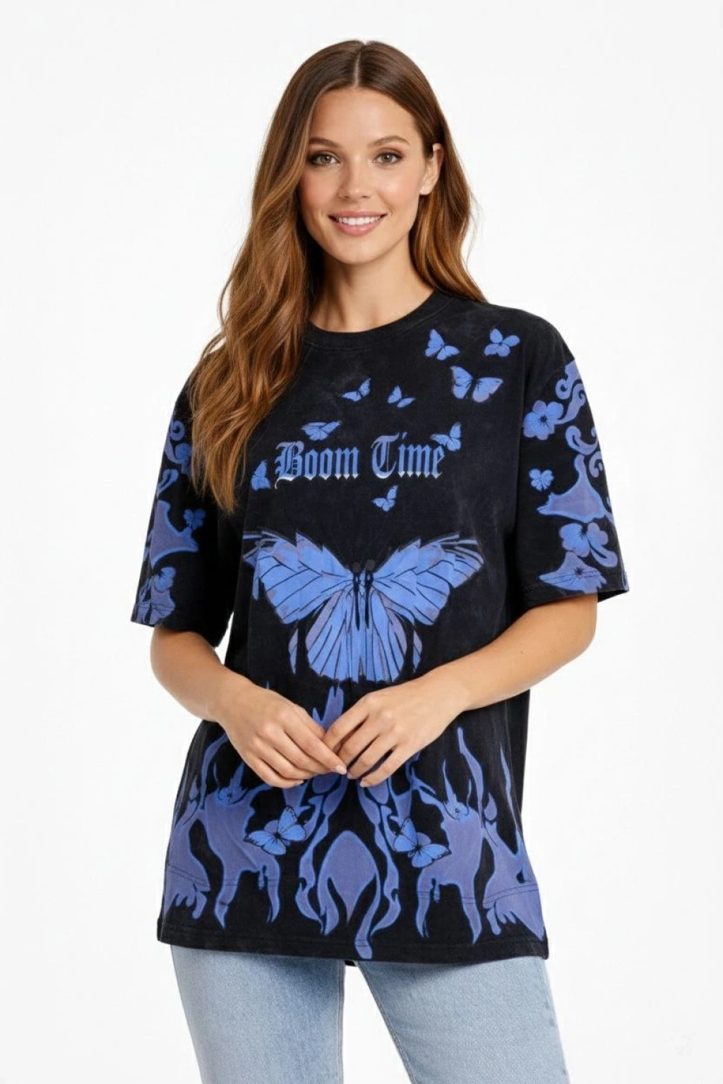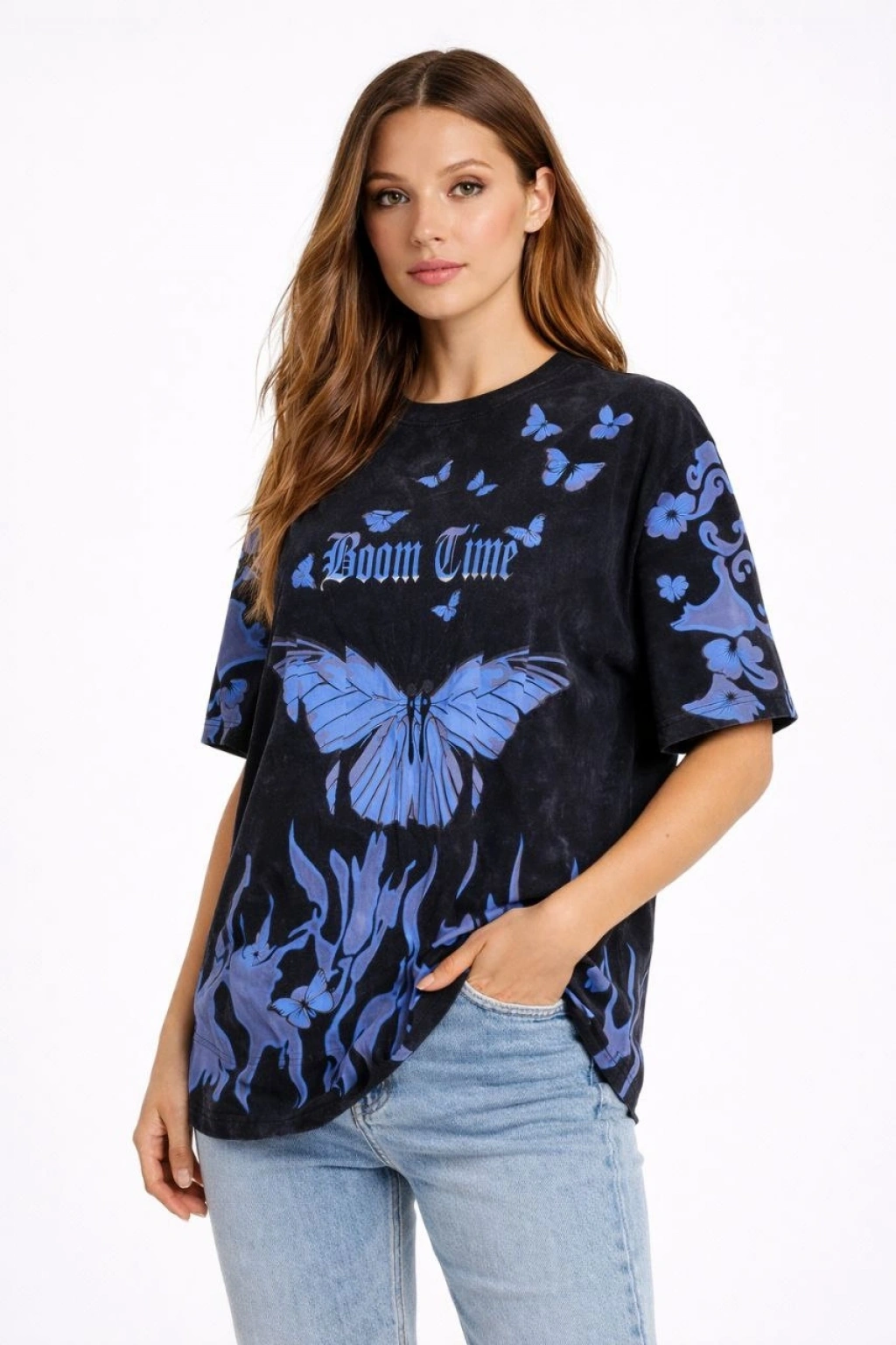 Kadın Asit Yıkamalı Oversize Tişört Future Worlds Baskılı Bisiklet Yaka Kısa Kollu Streetwear %100 Pamuk Street Style T-Shirt - Siyah