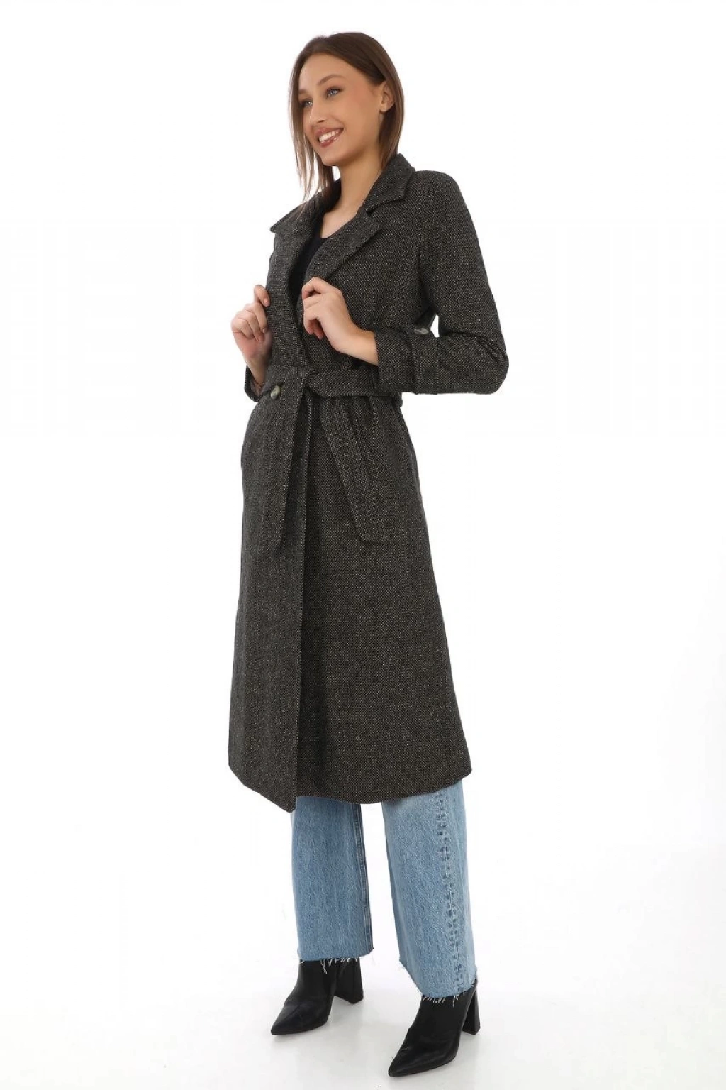 Kadın Astarlı Balık Sırtı Kaşmir Kaşe Kaban - Kahverengi