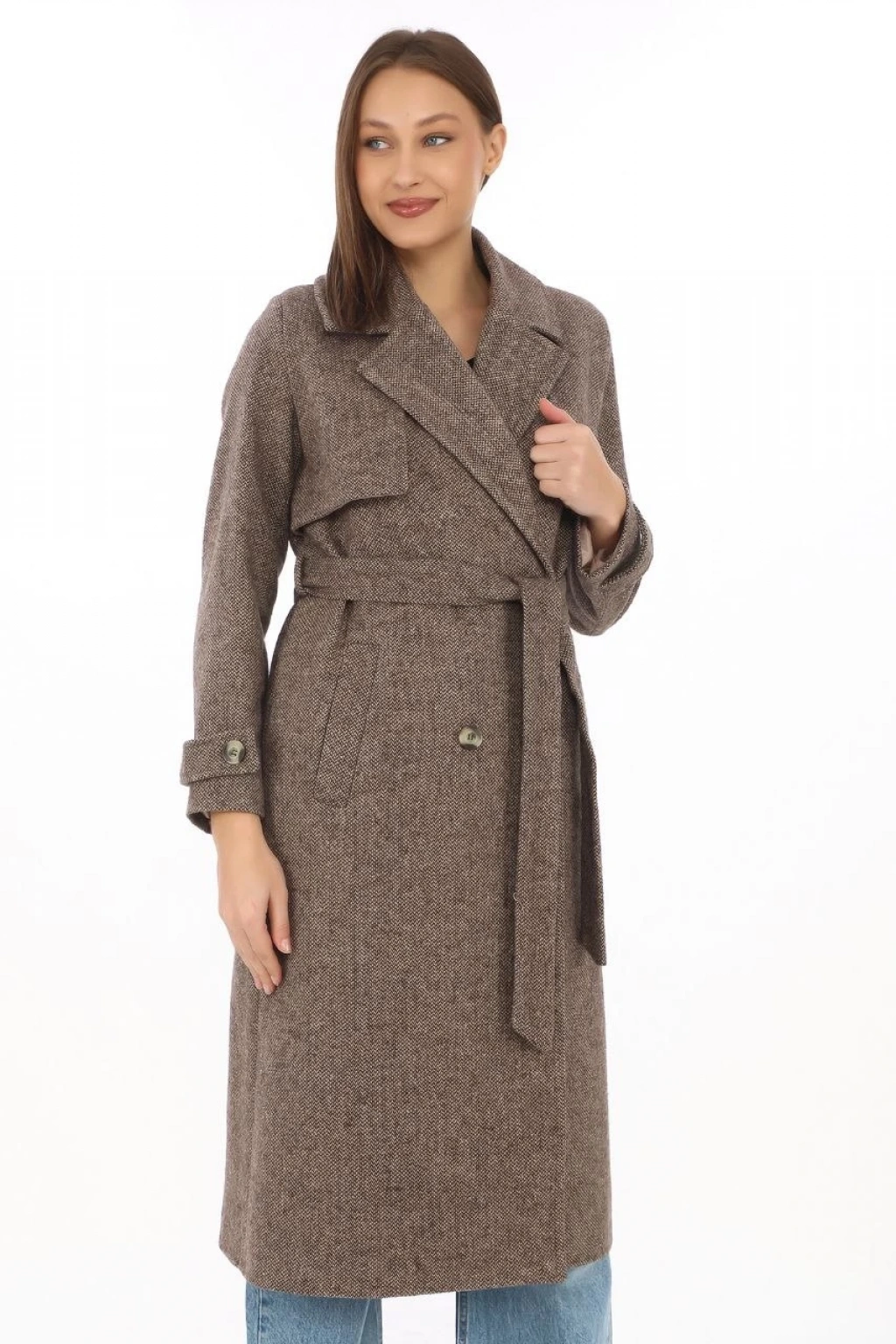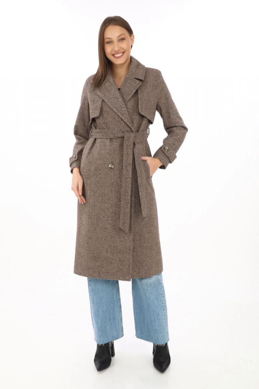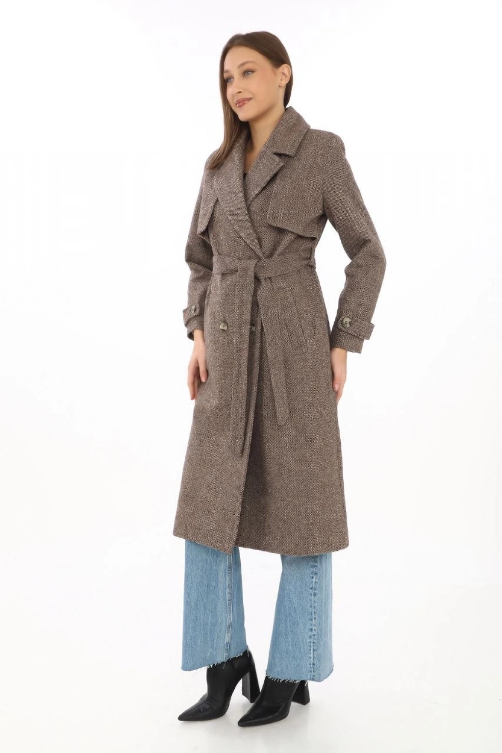 Kadın Balık Sırtı Yünlü Dokuma Kaşe Kaban – Kruvaze Yaka, Kuşaklı, Cepli, Astarlı Uzun Boy Tesettür Şık Kışlık Kaşe Kaban Modeli - Vizon