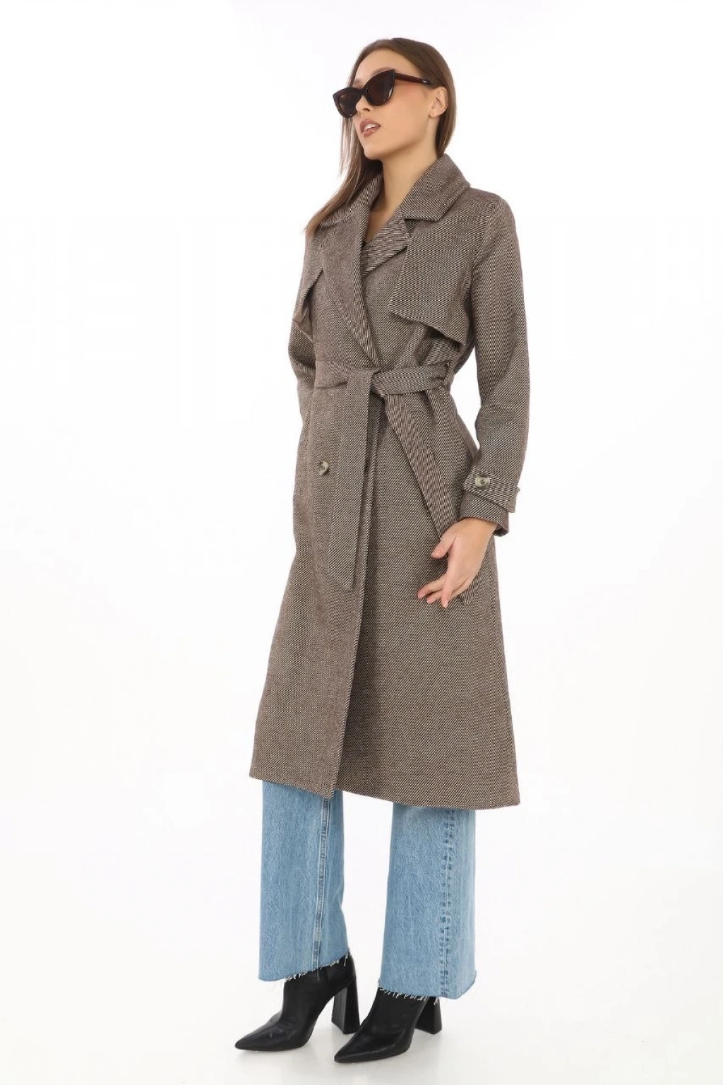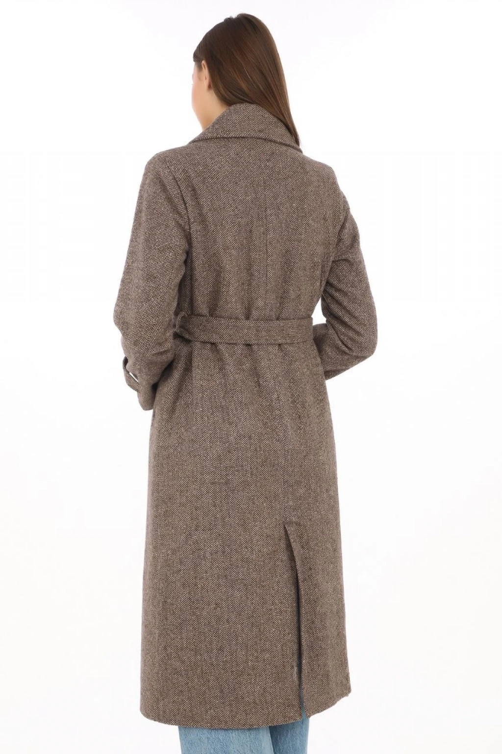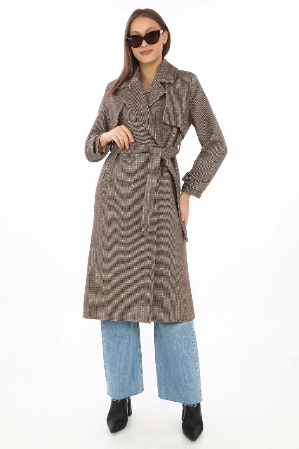 Kadın Balık Sırtı Yünlü Dokuma Kaşe Kaban – Kruvaze Yaka, Kuşaklı, Cepli, Astarlı Uzun Boy Tesettür Şık Kışlık Kaşe Kaban Modeli - Vizon