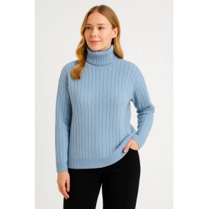 Kadın Balıkcı Yaka Bağazlı Triko Kazak Pamuklu Kalın Fitilli Dokuma - Bebek Mavisi