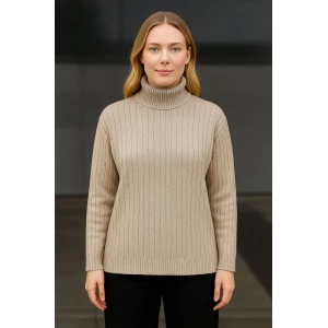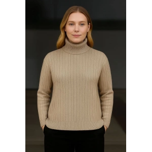 Kadın Balıkcı Yaka Bağazlı Triko Kazak Pamuklu Kalın Fitilli Dokuma - Bej