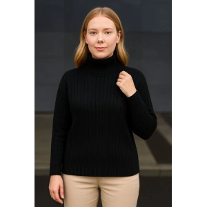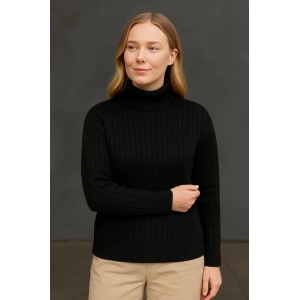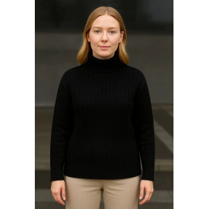 Kadın Balıkcı Yaka Bağazlı Triko Kazak Pamuklu Kalın Fitilli Dokuma - Siyah