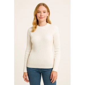 Kadın Bisiklet Yuvarlak Yaka Triko Kazak Pamuklu Kalın Fitilli Dokuma, Regular Fit Uzun Kollu Kışlık Model - Beyaz