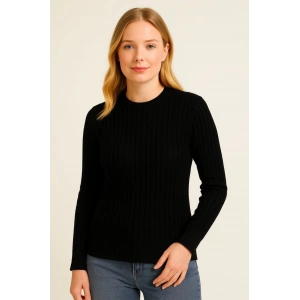 Kadın Bisiklet Yuvarlak Yaka Triko Kazak Pamuklu Kalın Fitilli Dokuma, Regular Fit Uzun Kollu Kışlık Model - Siyah