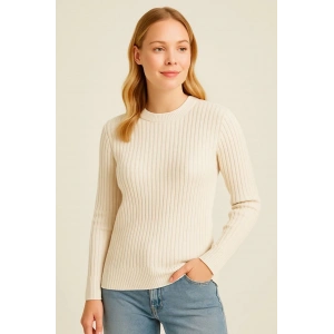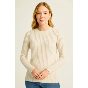 Kadın Bisiklet Yuvarlak Yaka Triko Kazak Pamuklu Kalın Fitilli Dokuma, Regular Fit Uzun Kollu Kışlık Model - Bej