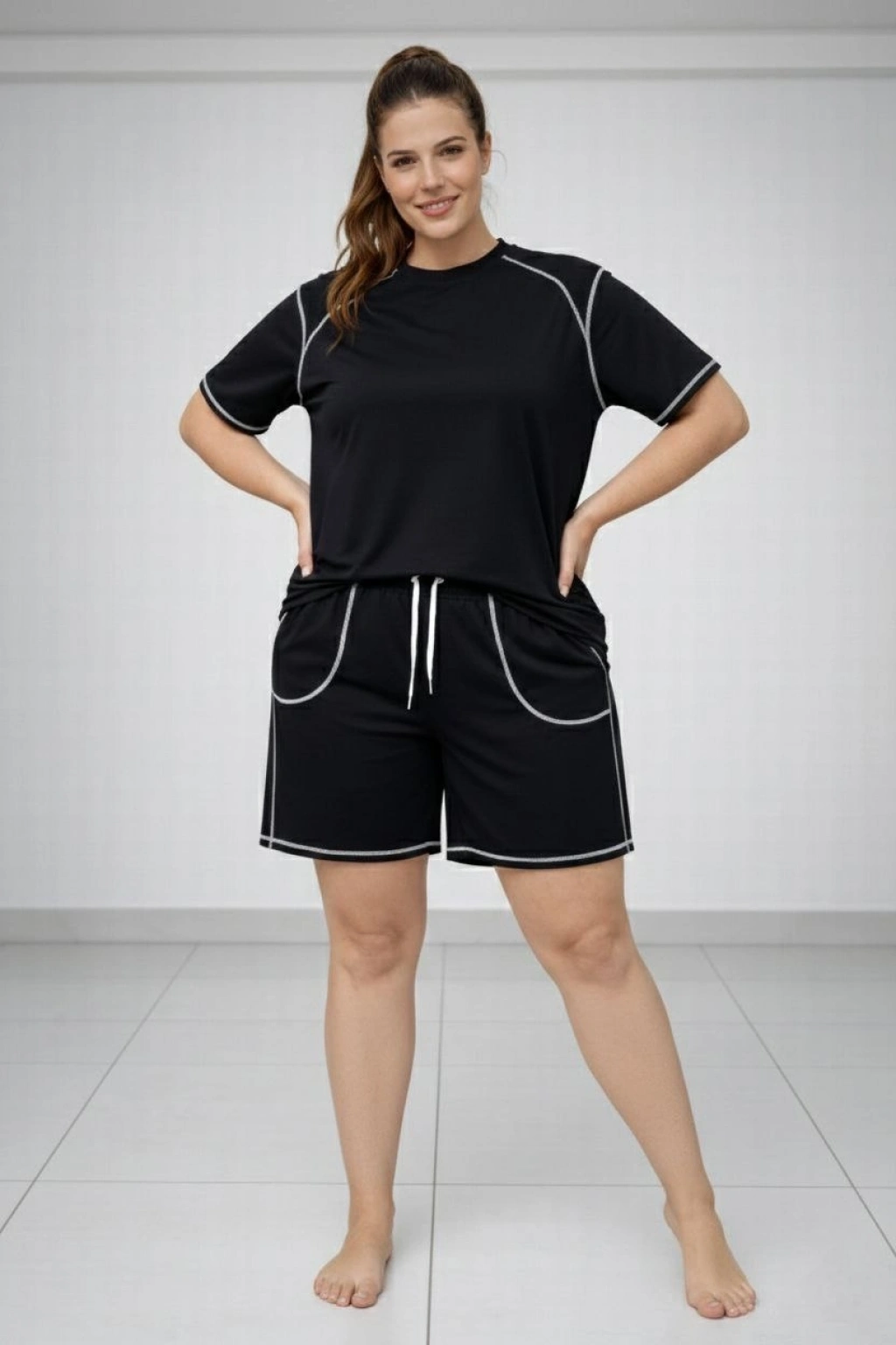 Kadın Battal Beden Kısa Kollu Tişört Şort Takım Kontrast Dikiş Detaylı Günlük Ev Giyimi - Siyah