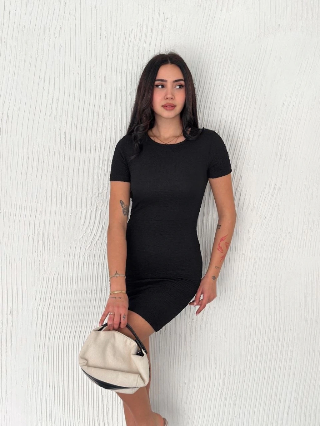 Kadın Göğsü Bağlamalı Kalp Yaka Kolları Şifon Mini Elbise - Siyah