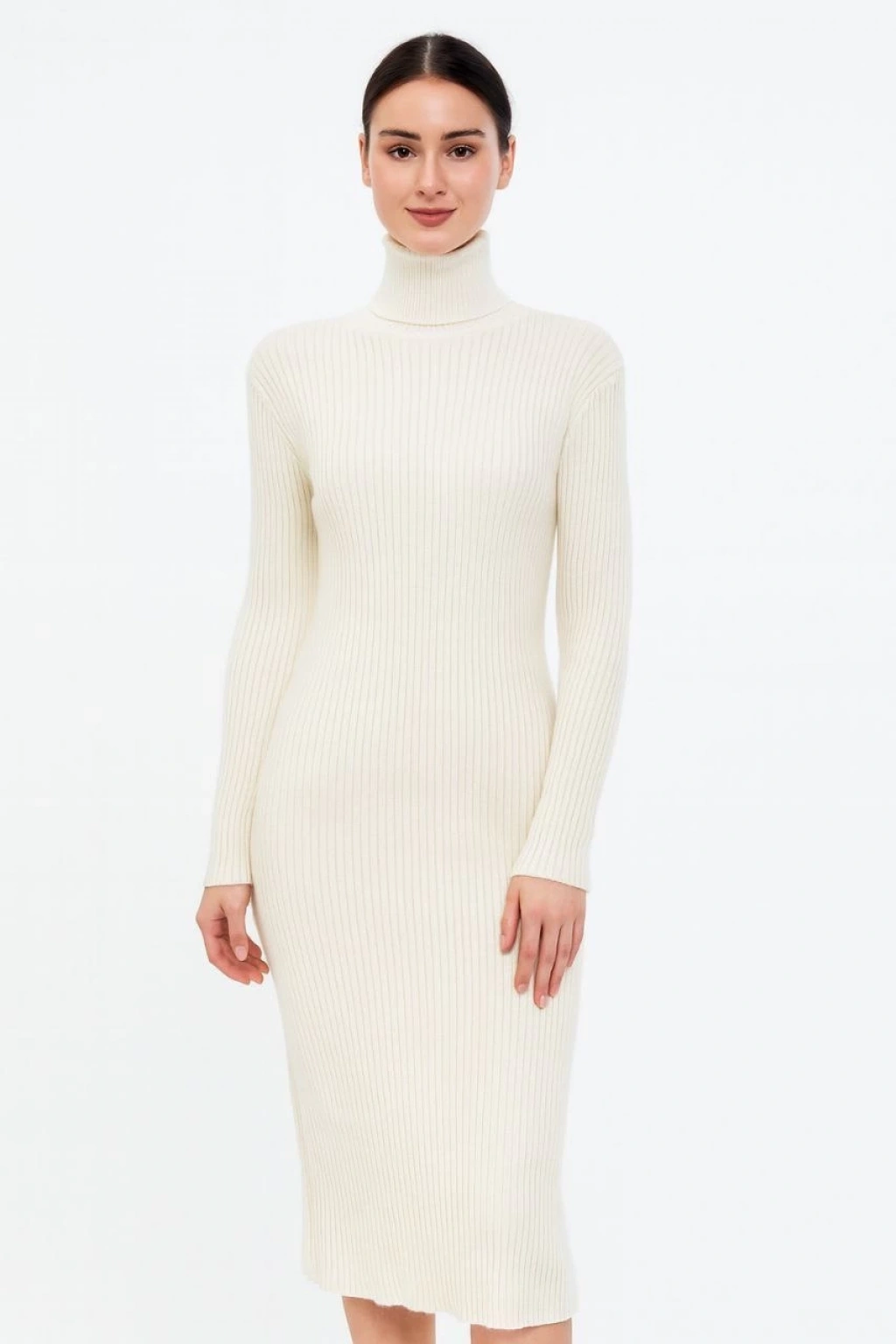 Kadın Boğazlı Uzun Fitilli Triko Dokuma Elbise - Beyaz