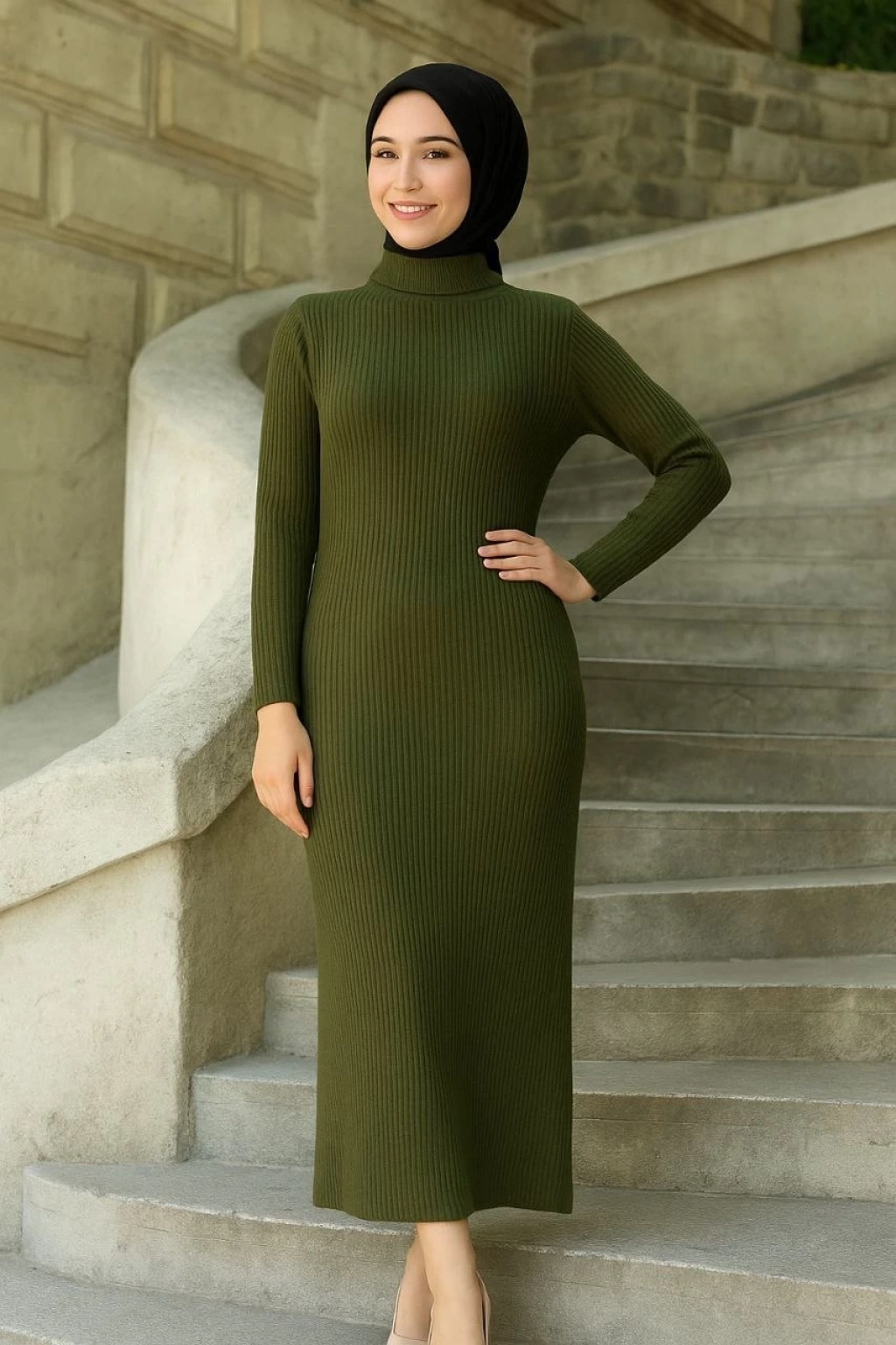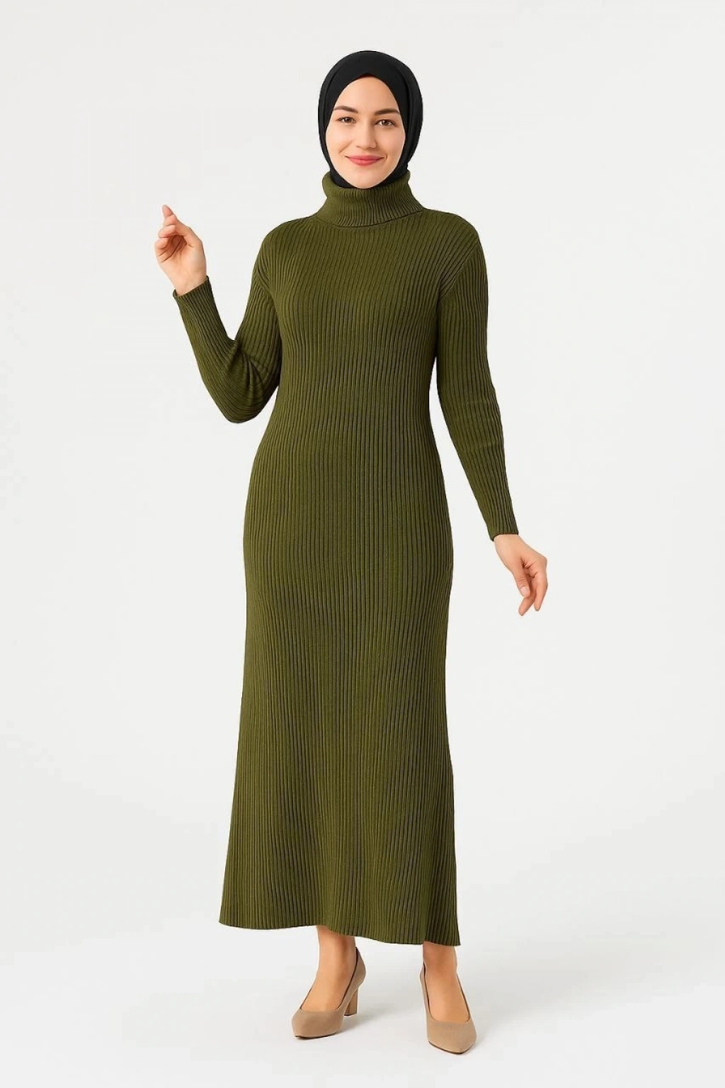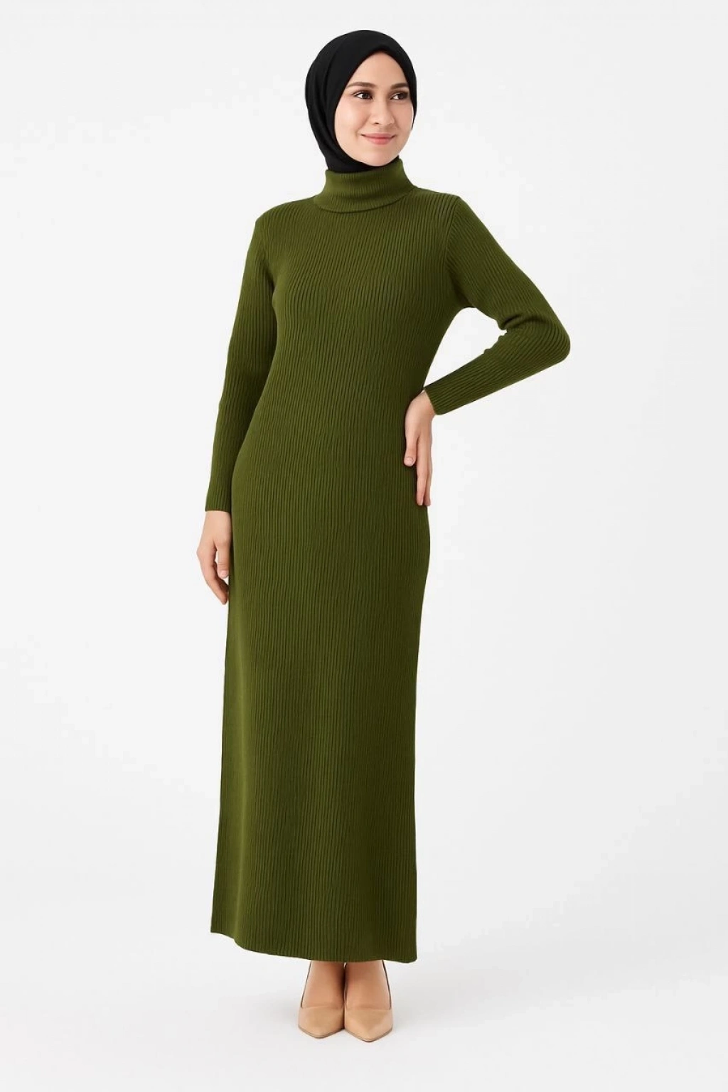 Kadın Boğazlı Triko Elbise – Uzun Fitilli Esnek Dokuma, Tam Kalıp, Kışlık & Baharlık Şık Rahat Stil, 130 cm Midi Boy Elbise - Haki