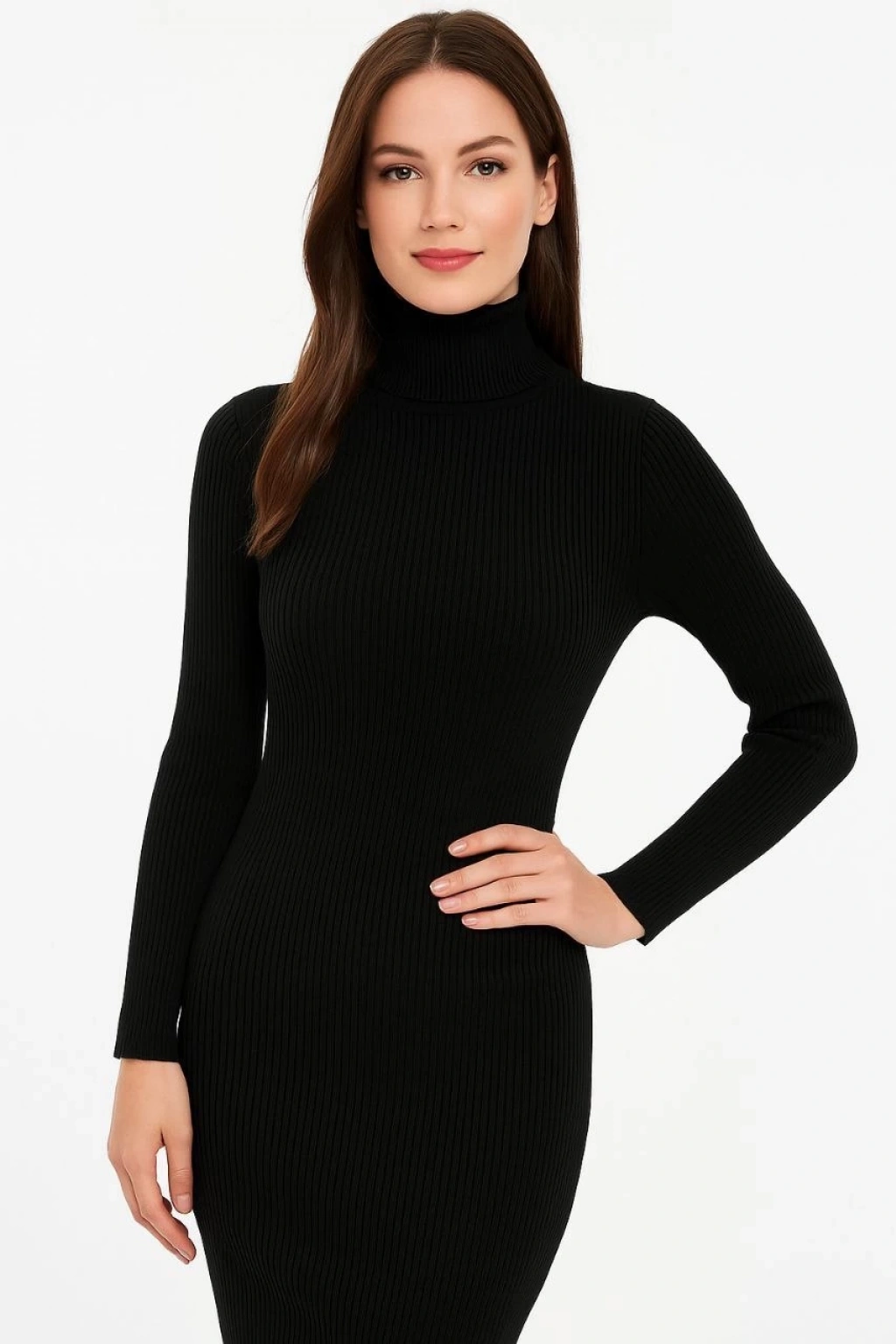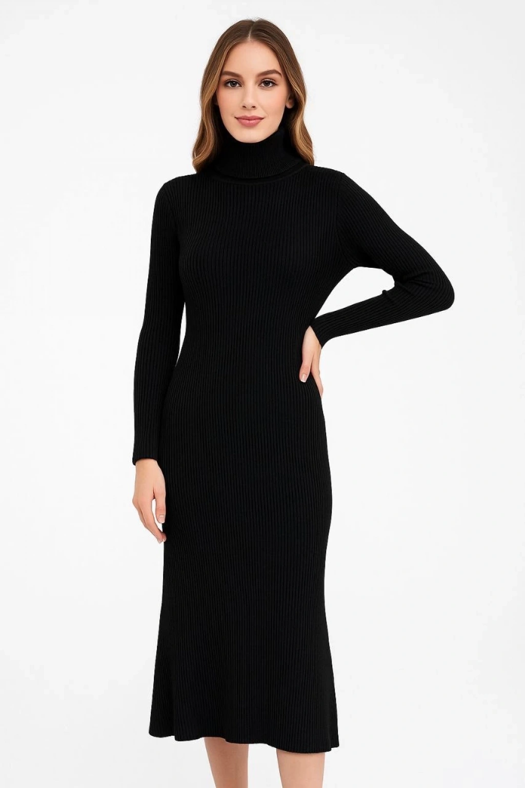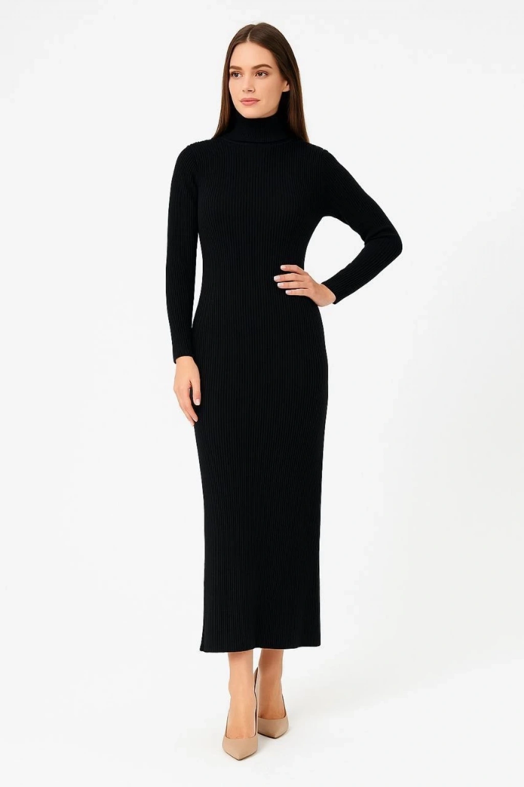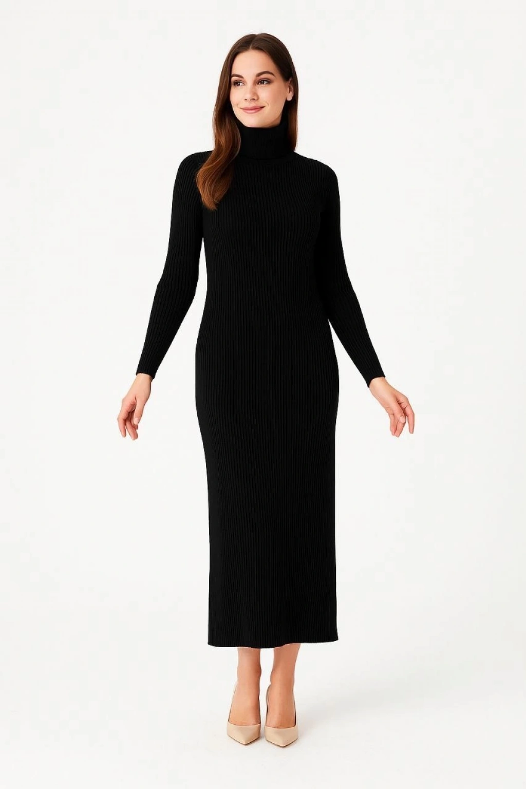 Kadın Tesettür Triko Elbise – Boğazlı Uzun Fitilli Dokuma, Esnek Tam Kalıp, 130 cm Midi Boy, Bahar & Kış Şık Rahat Stil - Siyah