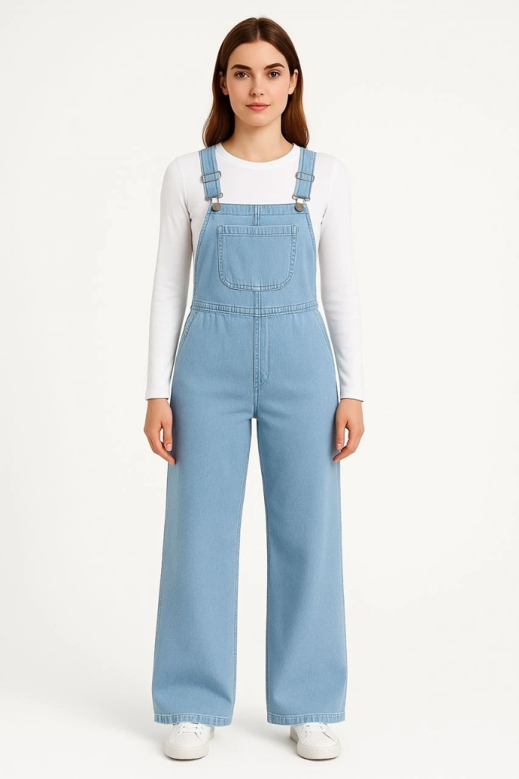 4 mevsimKadın Chambray Açık Mavi Denim Görünümlü Geniş Paça Salopet Tulum