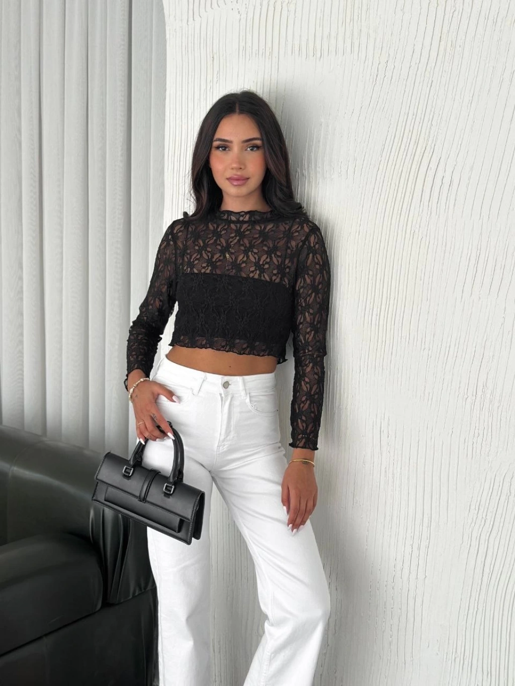 Keten Uzun Kol Bağacık Detaylı Bluz - Siyah