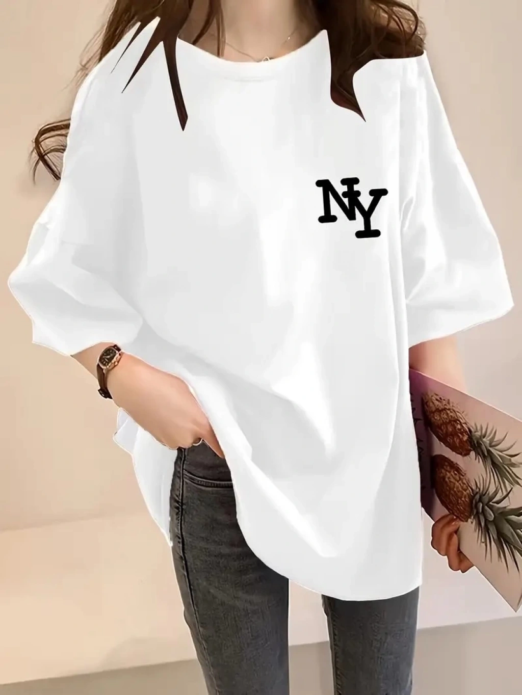 AICG Ön Arka Baskılı Bisiklet Yaka Kadın Oversize Bisiklet Yaka T-shirt - Beyaz