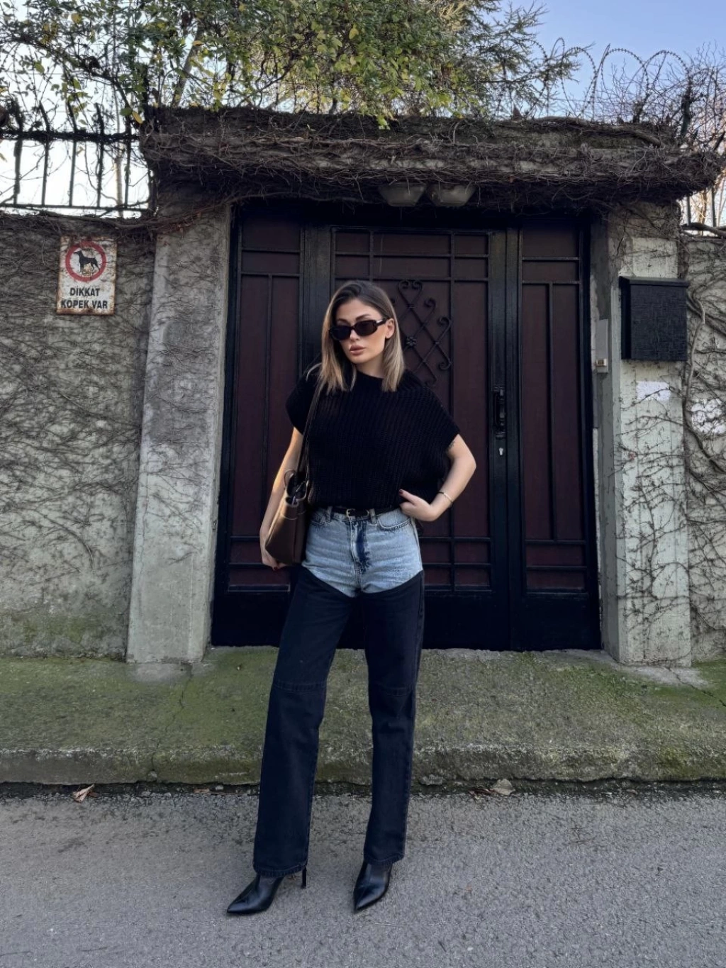Kadın Jeans Kot Parçalı Palazzo Pantolon - Siyah