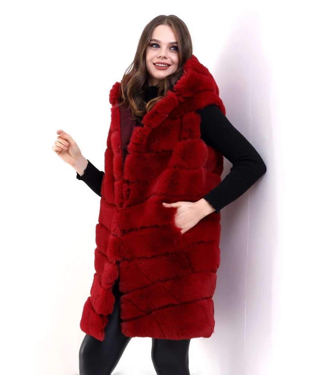 Kadın Kapşonlu Peluş Kürk Yelek Premium Kalite, Tam Astarlı, Uzun Model - Sarı