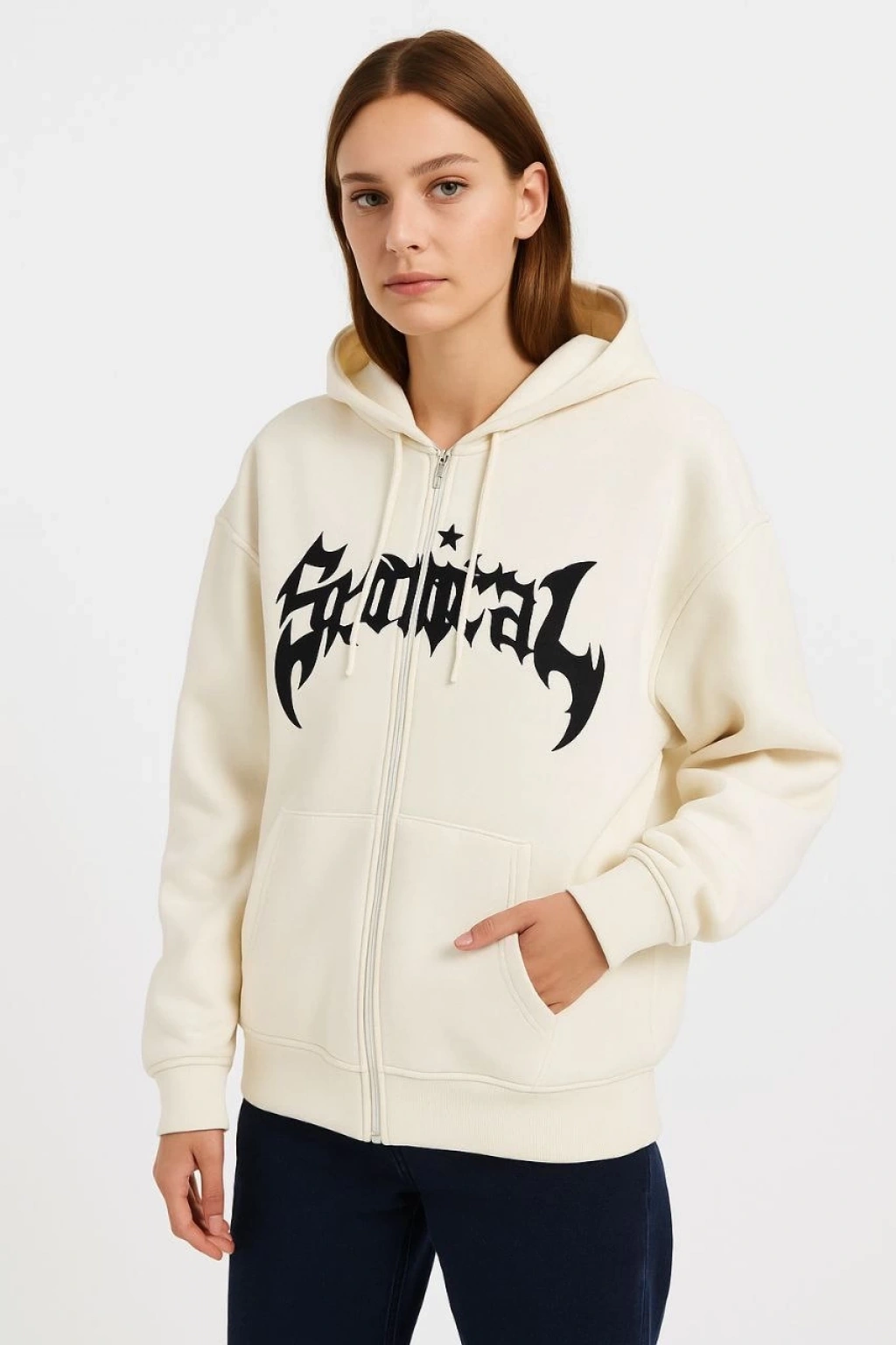 Kadın Oversize Dik Yaka Fermuarlı Sweatshirt - Zincir Nakışli Kanguru Cepli, - Beyaz