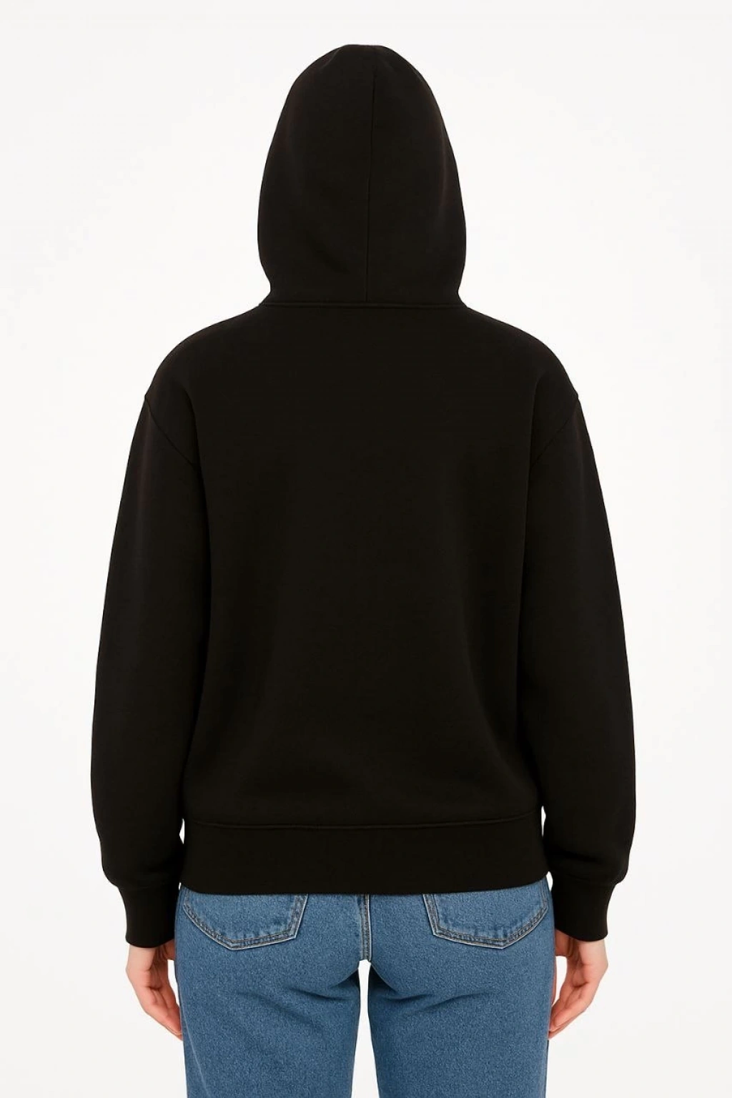 Üç İplik Baskılı Fermuarlı Kapüşonlu Hırka - Siyah