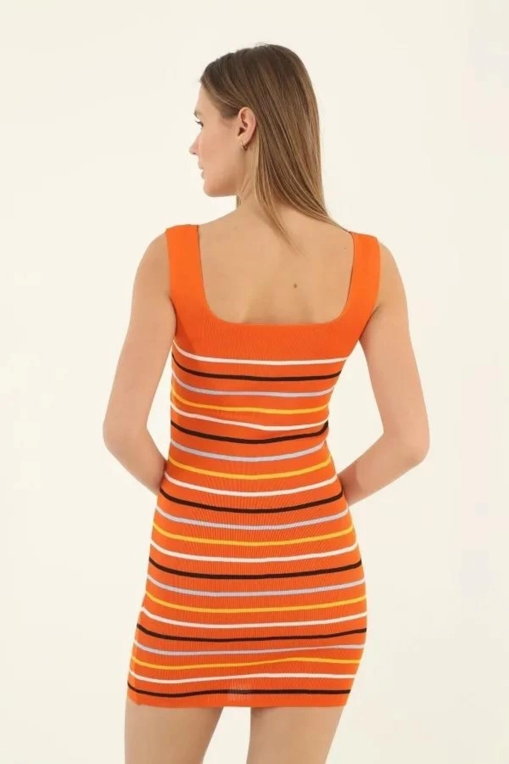 Kadın Kare Yaka Midi Boy Likralı Polelit Elbise - Turuncu