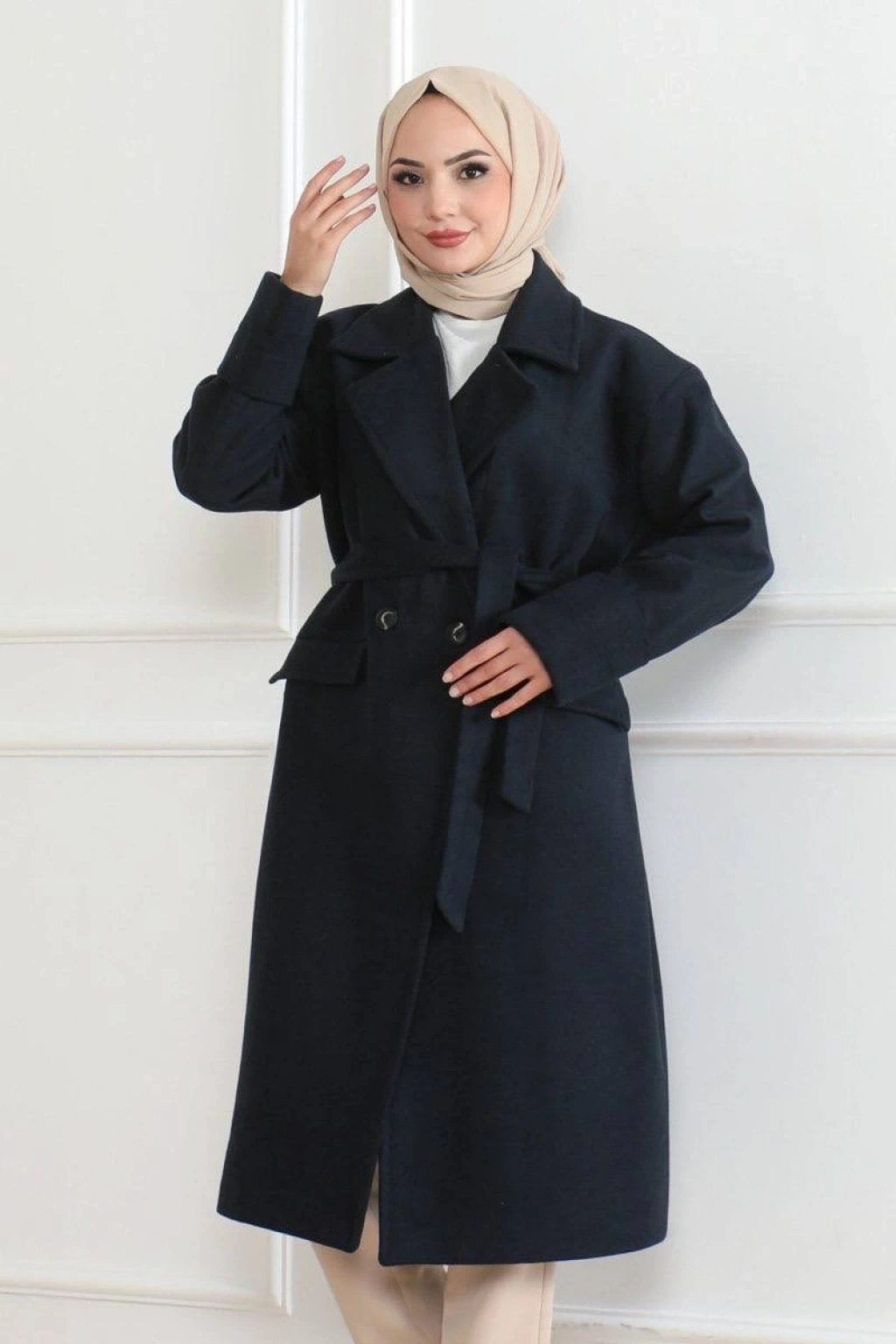 Kadın Kaşe Kaban – Uzun Boy Kruvaze Yaka Kuşaklı Tesettür Kaşe Kışlık Kaban, Astarlı Şık Yünlü Dokuma Oversize Rahat Kalıp Cepli Düğmeli Modern Kap Modeli - Lacivert